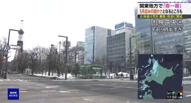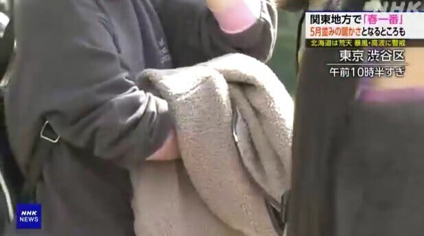 春天來了……日本氣象廳周一(23日)上午宣布,關東颳起在春天從南方吹來的第一陣強風(日本稱:春一番)。在關東一帶,部分地區氣溫上升,暖意洋洋如5月,但北海道卻天氣惡劣,氣象廳呼籲民眾注意強風及大浪。