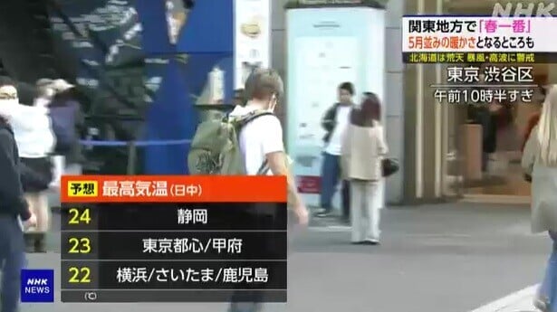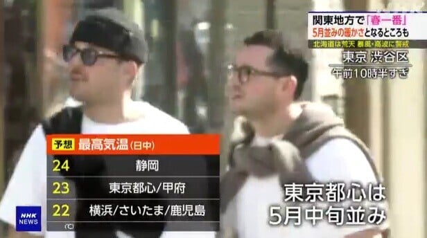 氣象廳預測,靜岡市最高氣溫可能升至24度、東京都市區及甲府市等地23度,橫濱市、埼玉市、鹿兒島市等地可能升至22度。這代表東京市區暖和如5月。