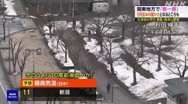 北海道的日本海沿岸地區持續吹強風,料到周一傍晚,海上也將翻起大浪,氣象廳呼籲民眾對強風及大浪提高警覺。此外,氣象廳指,降雨及天氣回暖可能加速積雪融化,積雪較多的地區須注意雪崩及水浸等風險。