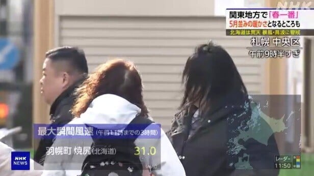此外,受低氣壓延伸前線影響,北海道及日本東北地區天氣惡劣,北海道羽幌町燒尻截至上午11時的3小時最大瞬間風速為每秒31公尺。