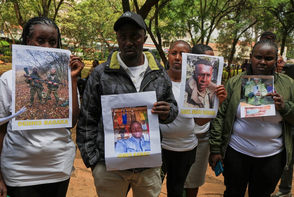 親屬展示被招募到烏克蘭戰爭的肯雅人。(美聯社)