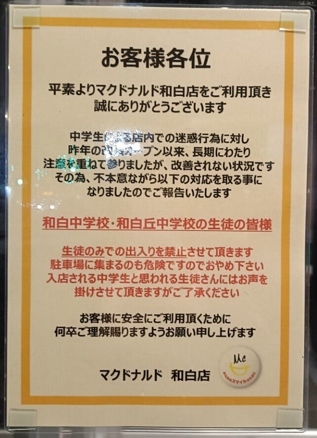 事件發生在福岡市和白地區的麥當勞分店,店舖門上貼出告示,表明禁止兩間中學的學生進入。該分店在2024年8月完成重新裝修復業,不過分店指一直有警告相關顧客的行為,但未有改善,表示「我們很遺憾通知,我們決定採取以下措施,包括「(相關)學生不得單獨進出店舖。在店舖的停車場聚集也有危險,故請勿聚集:我們會對任何看起來像是中學生的學生進行勸告。」並在告示上點名兩間中學。