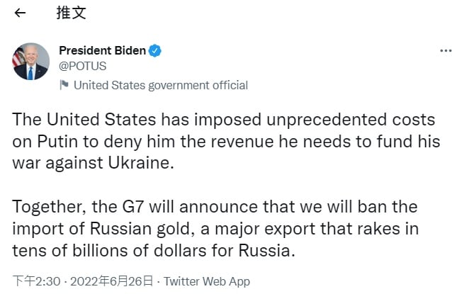 拜登在Twitter宣布,G7將禁止輸入俄羅斯黃金。(互聯網)