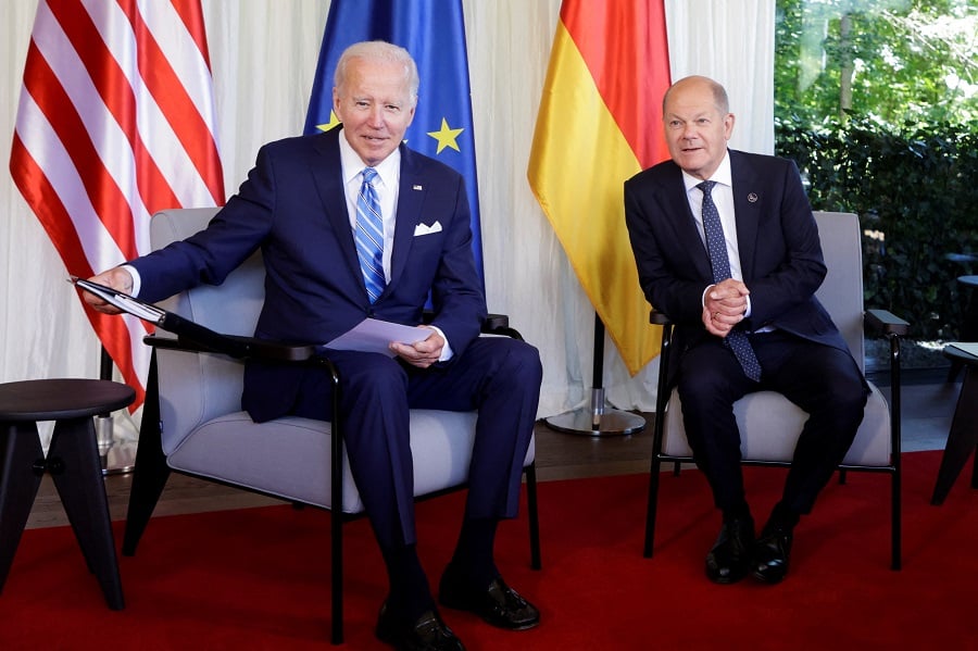 拜登在G7峰會前,先與東道主德國總理朔爾茨會晤。(路透社)