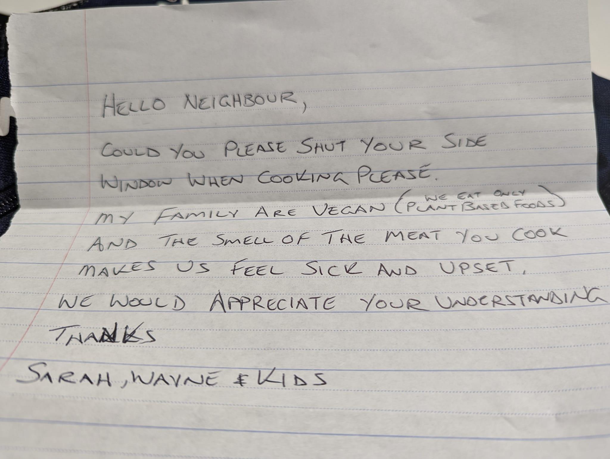 據當地媒體報道,一位住在珀斯海灘的居民凱莉在facebook上貼文表示,她的鄰居全家都是素食主義者,而某天他收到來自他們的信,要求他煮肉時把窗戶關起來,以免味道飄過去。信中寫道:「你好鄰居,你做飯時能關上側面的窗戶嗎?我的家人是素食主義者——我們只吃植物性食物——你煮的肉的味道讓我們感到噁心和不安。我們將感謝您的理解——謝謝。」網友們看到這封奇葩信件也湧入留言,「我敢打賭,當你修剪草坪時,她會開始流口水,她會聞到那股新鮮割草的味道」、「我才她煮的羽衣甘藍味道冒犯了咧!」、「我會在院子裏烤肉並邀請整條街的人來吃」、「不如花12個小時來做煙燻牛肉吧」。