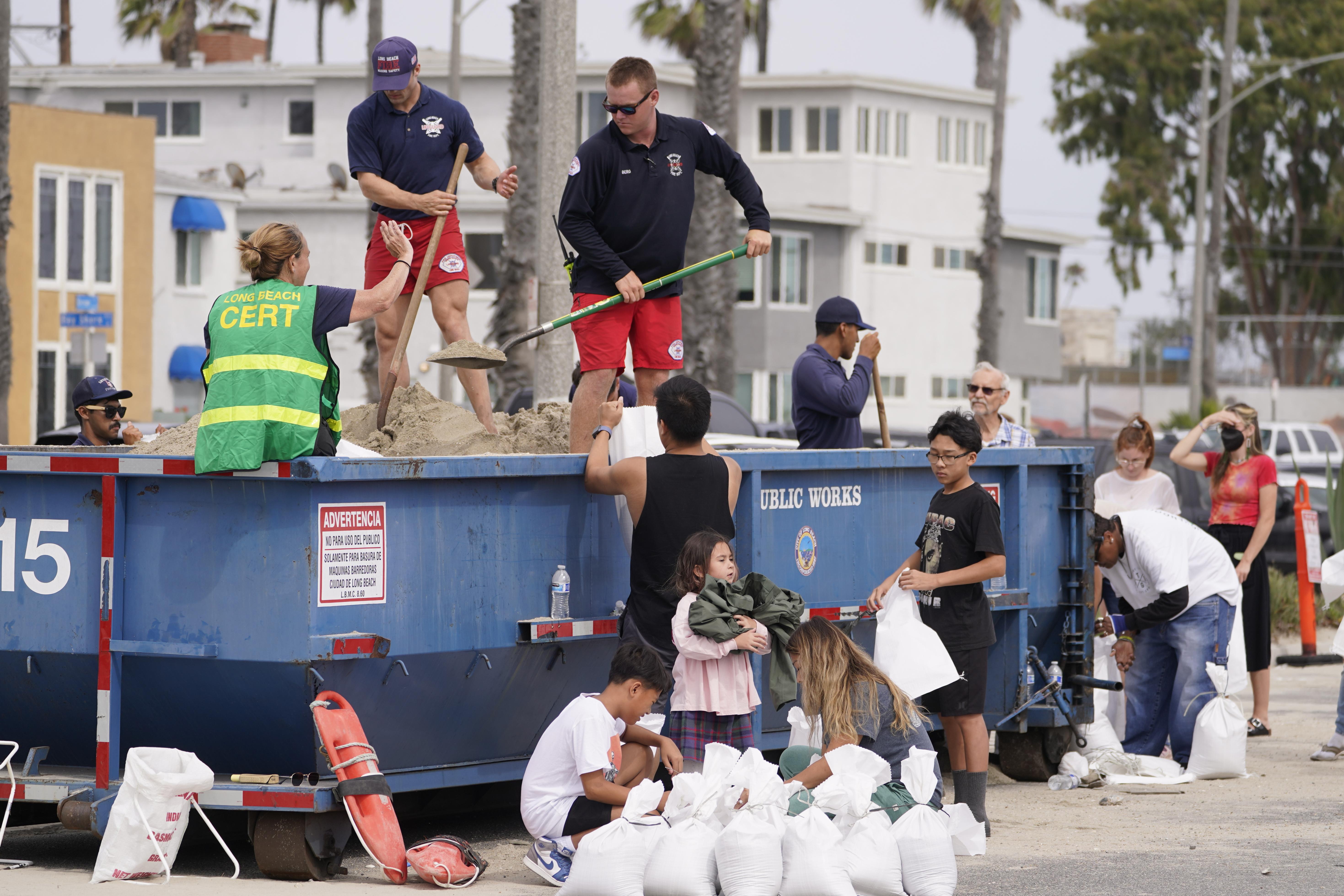 加州長灘的救生員搶在颶風來臨前為居民填滿沙袋。(圖/美聯社)