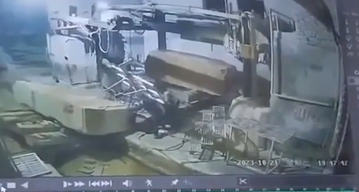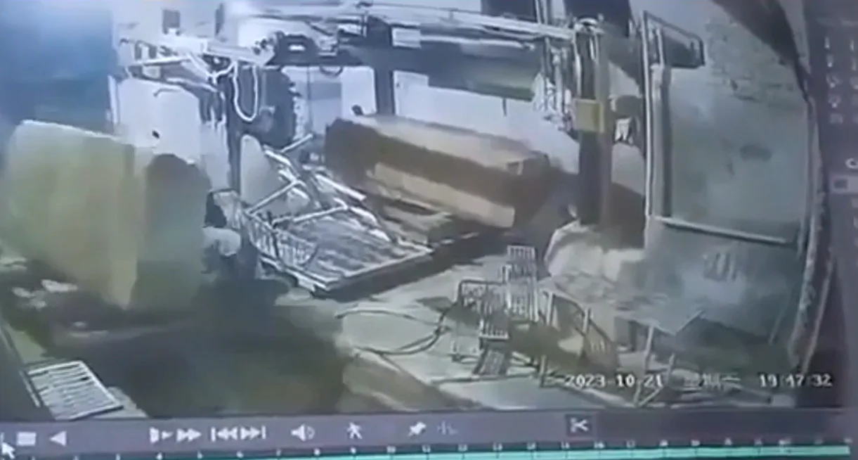 從工廠監視器畫面可以看到,原本有兩名工人站在一塊大石頭旁邊,進行切割作業,穿着黑衣服的站立用雙手支撐石頭,白衣服的工人則埋頭趕工。