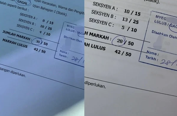 該名女子在小紅書上發文,分享自己考駕照的過程,宛如打魔王關一樣困難重重,在馬來西亞的駕照筆試中,共有50題需要作答,一題一分,通過的標準是答對42題以上,女子第一次測驗時,考了30分,但她沒有因此灰心,決定再接再厲,複習題庫1個小時後,自信滿滿地再度前往應考,作答時感覺相當順利,沒想到成績出來後發現,第二次反而考得更差,只拿到了28分,讓她哭笑不得。