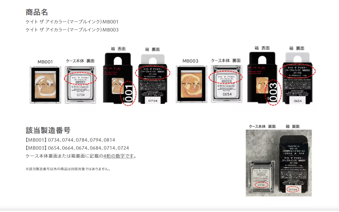 據《產經新聞》、《神戶新聞》等日媒報導,本次回收對象為在日本時間今年1月20日起發售,開架彩妝品牌KATE(凱婷)的「粹選單色眼影(漸層大理石)」系列。據悉,由於部分產品容器內部發現附著鋁的細微碎片,可能會導致眼部受傷。再加上該眼影適用於眼周範圍,作為預防措施,自4月11日起主動召回以下序號產品。