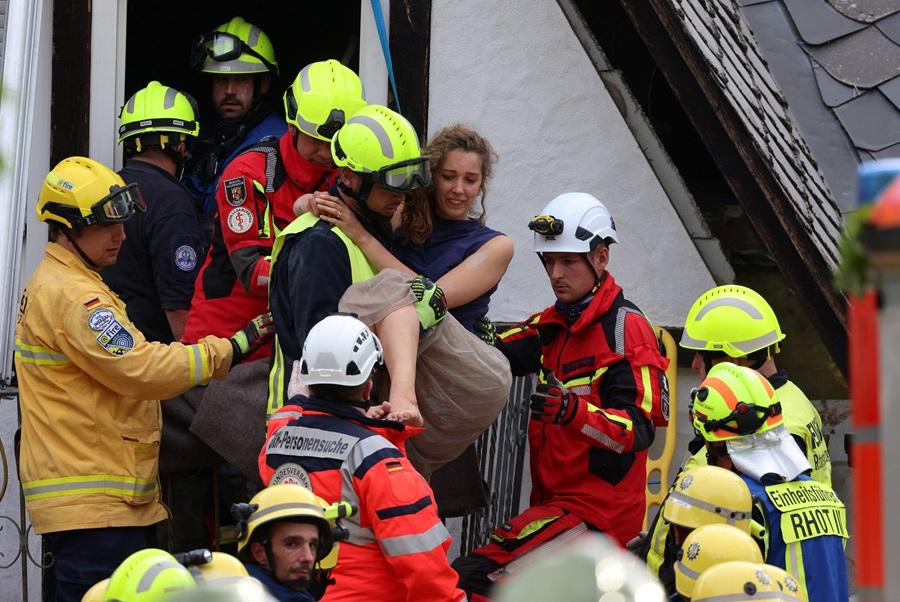 德國酒鄉克勒夫(Kroe)一間古式酒店周二深夜11時倒塌,搜救人員在瓦礫下發現一具遺體,另有8人被困。當時酒店內有14人,其他人安全逃脫。酒店位於莫瑟爾河(Moselle)旁,照片可見拯救人員早上抱著一名赤腳女子步出倒塌的建築物。當局在事發後兩個多小時稱,救出兩名女子、一名男子和一名兩歲兒童,受傷情況未明。
