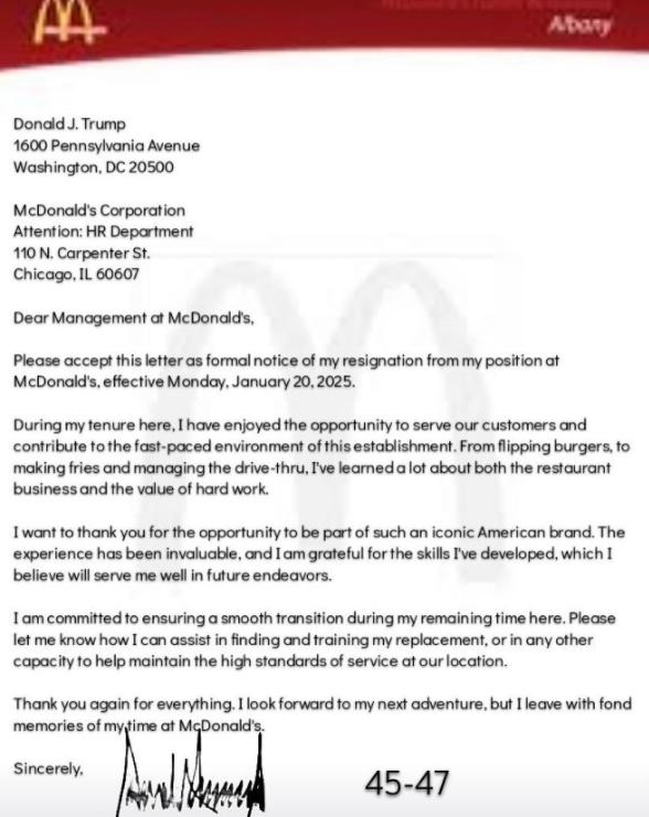 該封辭職信的地址是華盛頓賓夕法尼亞大道1600號,就是白宮的地址。而他在麥當勞「離職」的日期則是總統就職典禮當天。特朗普在信上的簽名還標有「45-47」,象徵他是美國第45及47任總統。而這封獨一無二的辭職信,在IG獲得47萬個點讚。