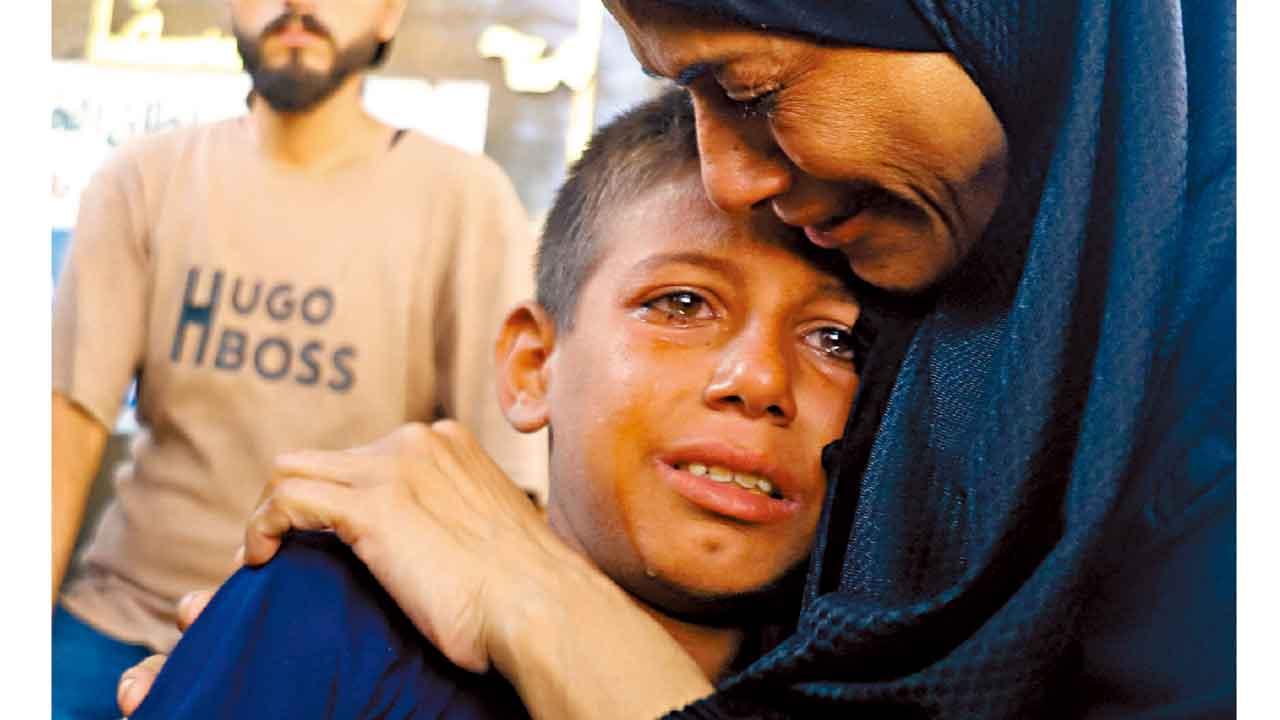 加沙城周四舉行喪禮送別在領取救援物資時,遇以軍槍火死亡的巴人,一名男童悲從中來。(路透社)