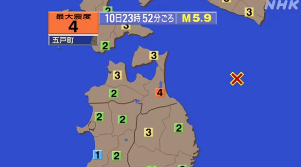 日本傳媒報道,日本氣象廳觀測顯示,當地時間12月10日晚上11時52分,青森縣以東海域發生黎克特制5.9級地震,震源深度30公里。