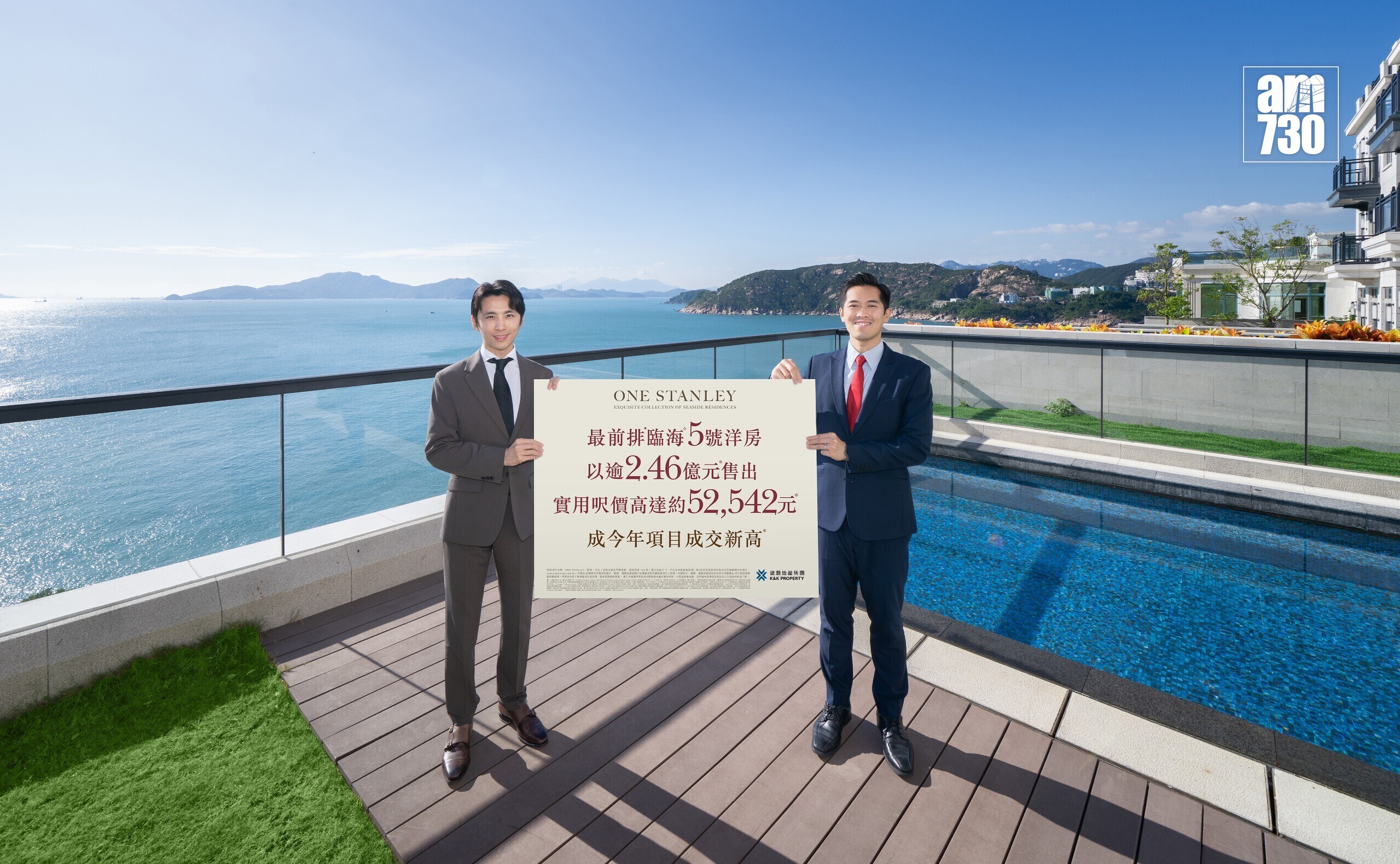 建灝地產旗下赤柱臨海超級豪宅「ONE STANLEY」銷情持續暢旺,單日連錄2宗成交。發展商剛宣佈項目第 8 座之地下花園分層大宅以2,768 萬元成交後,旋即公佈另1宗大額洋房成交,該洋房為位於項目最前排「ASTA AVENUE」之臨海5號洋房,是日透過招標形式以成交價逾2.46億元售出,呎價約52,542元,成為項目今年成交價新高。