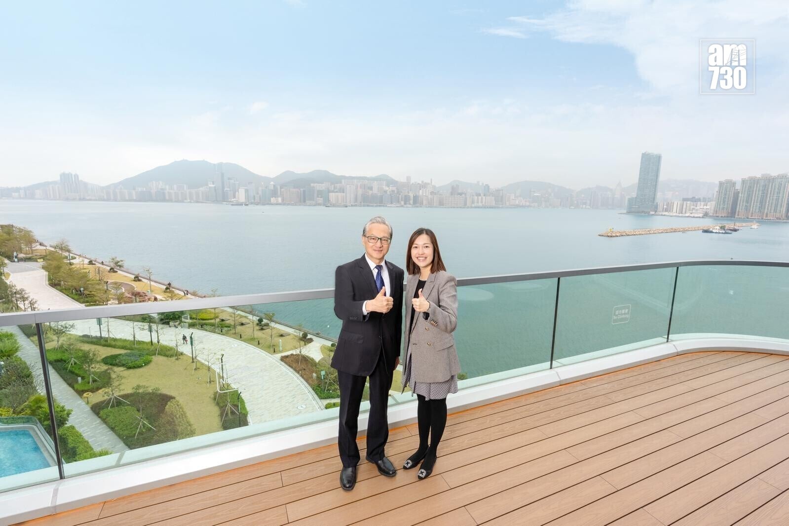 中國海外地產有限公司董事總經理游偉光(左)及助理總監何家宜(右)於臨海住客會所Club Voyage內拍攝。