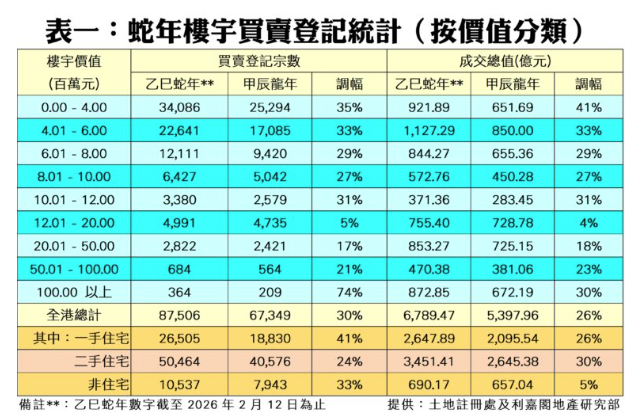檢視各類物業市場,一手住宅於蛇年(2025年)表現最耀眼,主要受惠去年2月《財政預算案》宣布將100元印花稅門檻放寬至400萬元或以下物業,刺激發展商針對政策大推細價新盤。此外,接近蛇年年底前,西沙大型新盤以貼市價連環搶攻,亦吸納了大量用家及投資者客源,推動全年登記量大升。觀察去年按月情況,自3月起至今年2月的蛇年共12個月,按月均錄逾千宗的一手買賣登記,結果帶動整個蛇年,截至2月12日止,全港共錄一手住宅買賣26,505宗,較龍年全年的18,830宗已急升41%,為升幅最凌厲的物業類別;而成交總值也較龍年大升26%,錄2,647.89億元。