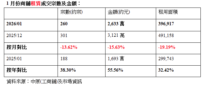 隨著聖誕新年檔期告一段落,市場開始爲即將到來的新春檔期作準備,相對於2025年新春檔期,今年商舖租賃市場的成交宗數及金額按年均錄得顯著升幅,反映本港舖市復甦情況仍然樂觀。據中原(工商舖)統計,1月份商舖租賃市場錄得約260宗成交,涉及成交金額約2,633萬元,按年升幅分別達38.3%及55.56%。中原分析,傳統零售業旺季即將完結,再加上節日情緒放緩交投,預料2月份商舖租務成交將保持平穩。