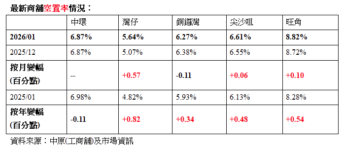 何潔釵指出,本港今年新春檔期的租務表現按年錄得顯著增幅,反映商舖租賃市場復甦步伐理想;然而,租務交投仍見按月輕微回落,或顯示商戶對新春檔期信心未及聖誕新年假期。受港人外遊、網購普及等因素影響,商舖空置率繼續錄得按月上升,令租金缺乏上調動力。何氏認為,隨着金融機構持續擴充,以及更多海外及內地企業來港開業,相信有望進一步消化現有空置,預料2月份商舖租賃成交宗數有望維持穩定。