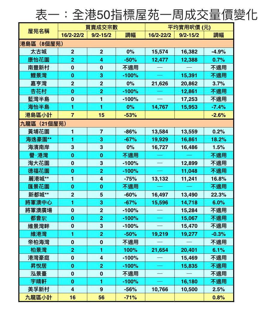 按地區劃分,上周港島、九龍及新界三區交投量全線向下,當中以九龍區的減幅最顯著,九龍區21個指標屋苑上周共錄16宗交投,較前周的56減少71%,當中黃埔花園及麗港城各錄1宗買賣,分別按周急減86%及75%;海逸豪園、新都城及將軍澳中心分別錄得1宗、2宗及1宗交投,按周減少介乎60%至67%;美孚新村上周錄得4宗買賣,較前周的9宗減少56%;維港灣交投量由前周的2宗,減少50%至上周的1宗。