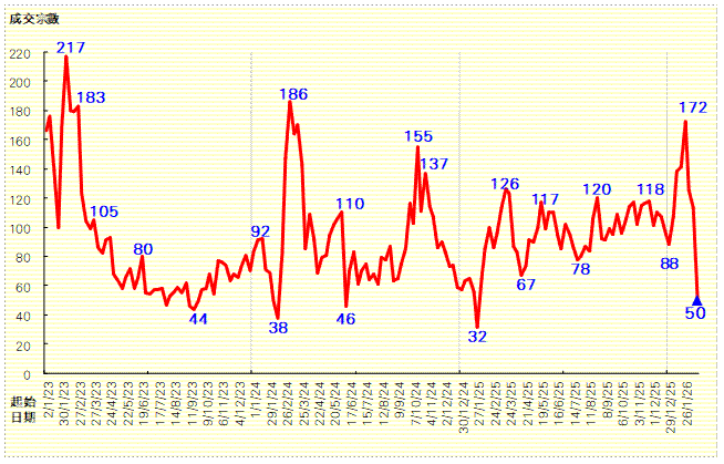 利嘉閣地產研究部主管陳海潮表示,上周正值農曆新春長假期,加上前後多請兩日假,即可連接兩個周末,自製九日悠長假期,故導致樓市交投幾近冰封,出現顯著回落。綜合利嘉閣地產分行數據所得,全港50個指標屋苑於上周(16/2—22/2)共錄50宗買賣個案,較前周(9/2—15/2)的113宗再減少56%,連減三周並創自去年農曆新年以後的五十五周新低,惟較對上一次農曆新年期間的32宗增加56%。