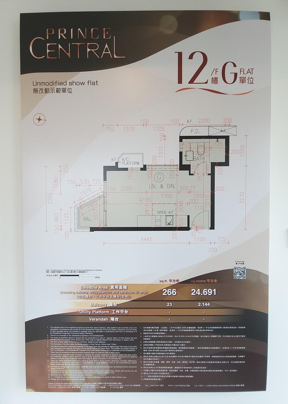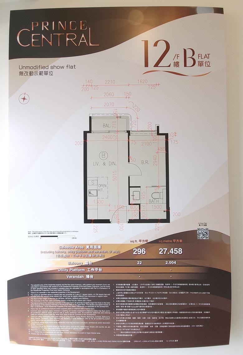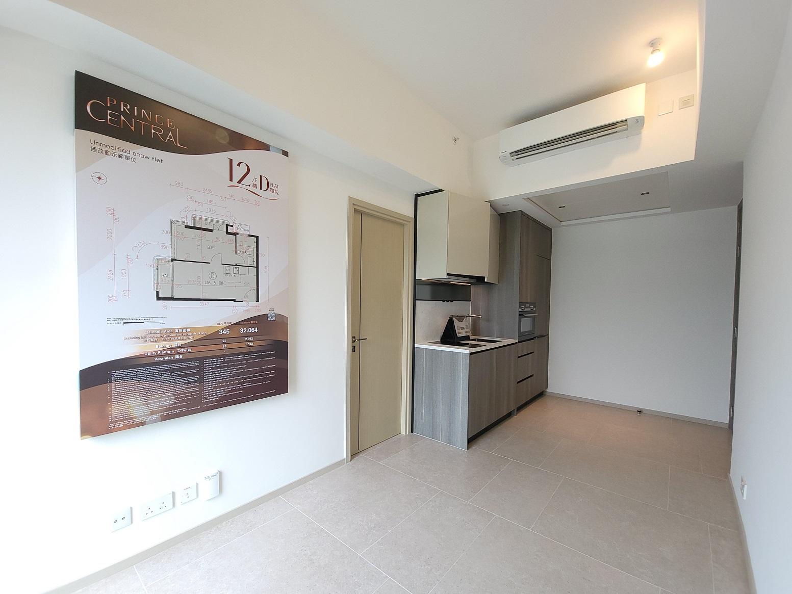 Prince Central早前開放會所設施參觀,並備有3個現樓示範單位,其中12樓B單位,屬一房間隔,實用面積296方呎,連22方呎露台,單位樓高約3.3米。大門配以Samsung三合一智能電子鎖,客飯廳呈長方形布局,全屋配備遮光窗簾,地台採用淺色瓷磚。客飯廳與露台相接加上落地玻璃趟門設計,加強室內空間感,更可吸納自然光線。