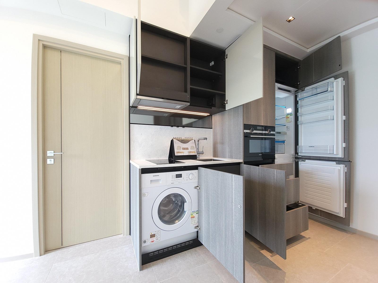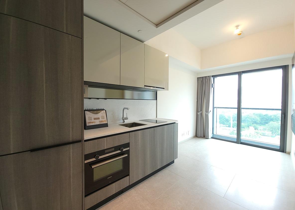 開放式廚房設計,並選用德國品牌家電,包括電磁爐、抽油煙機、雪櫃連冰箱+及洗衣/乾衣機等,配襯米色及木紋飾面廚櫃,提供收納空間予各式廚房用品。