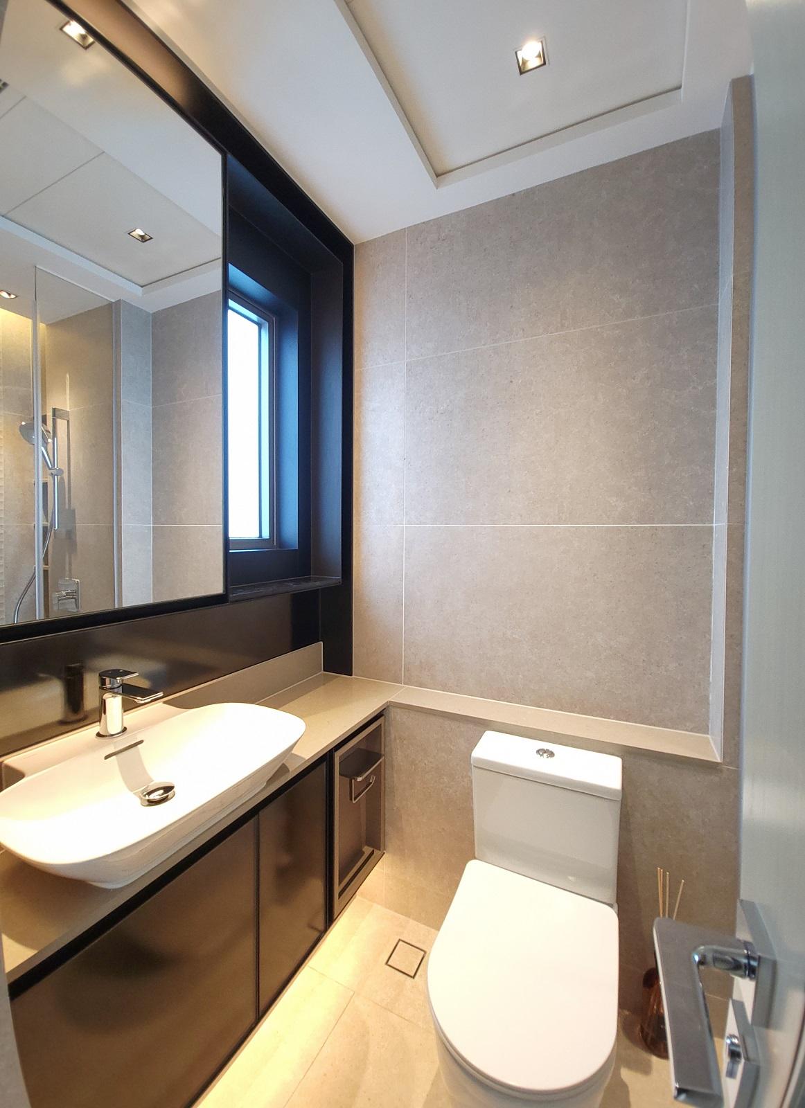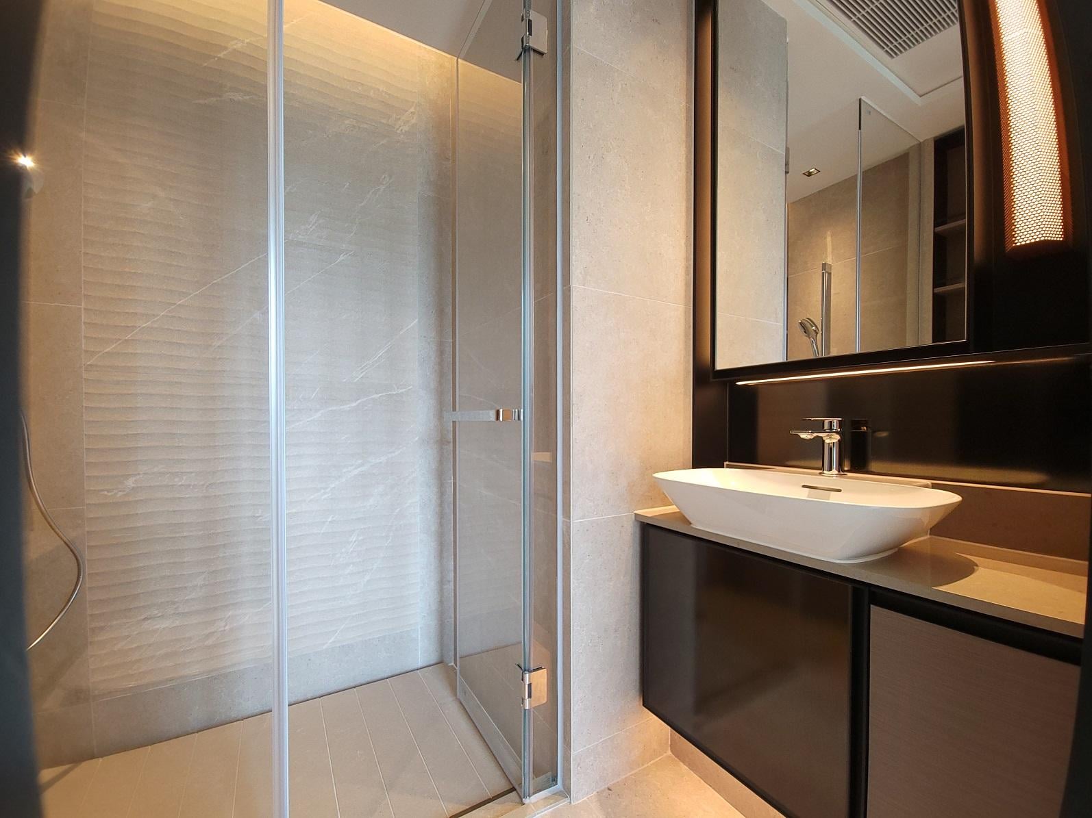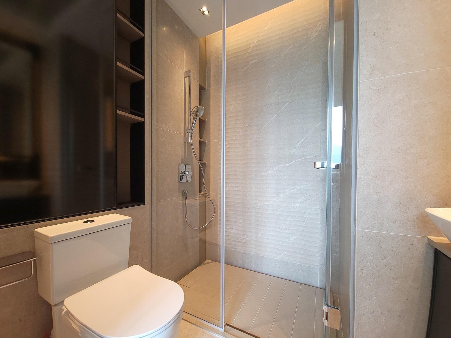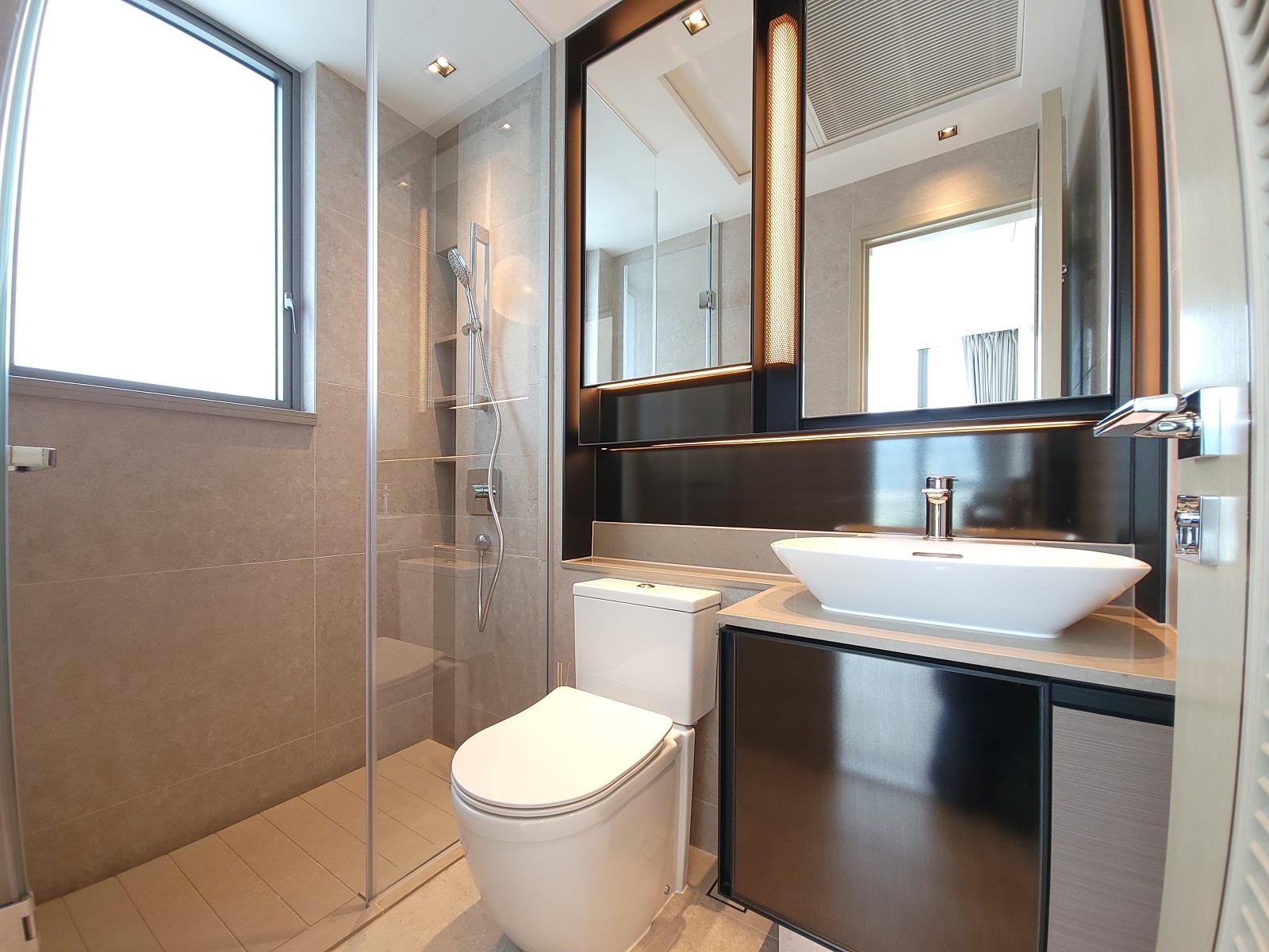 睡房與客廳的景觀同向,而睡房配有USB插頭的電插座。浴室為趟門設計,附有三件頭浴室配備,包括淋浴間、洗手盆及坐廁,及裝設有天花式浴室抽濕機,並配淺色調的檯面及牆身設計。