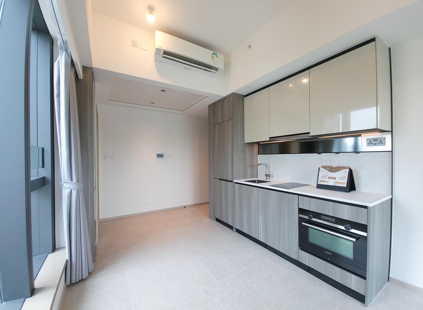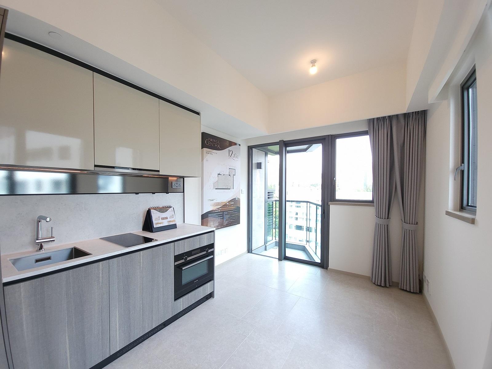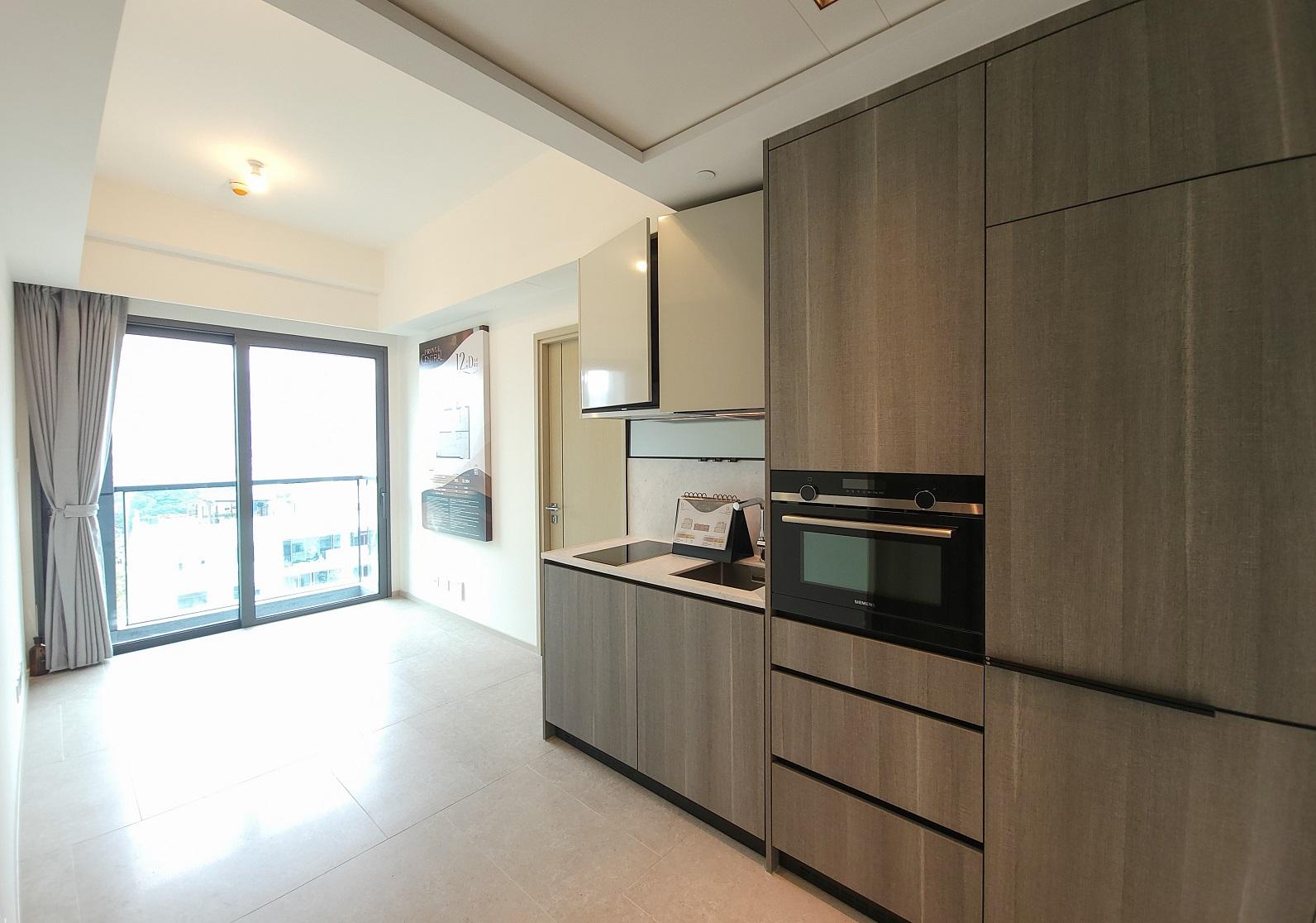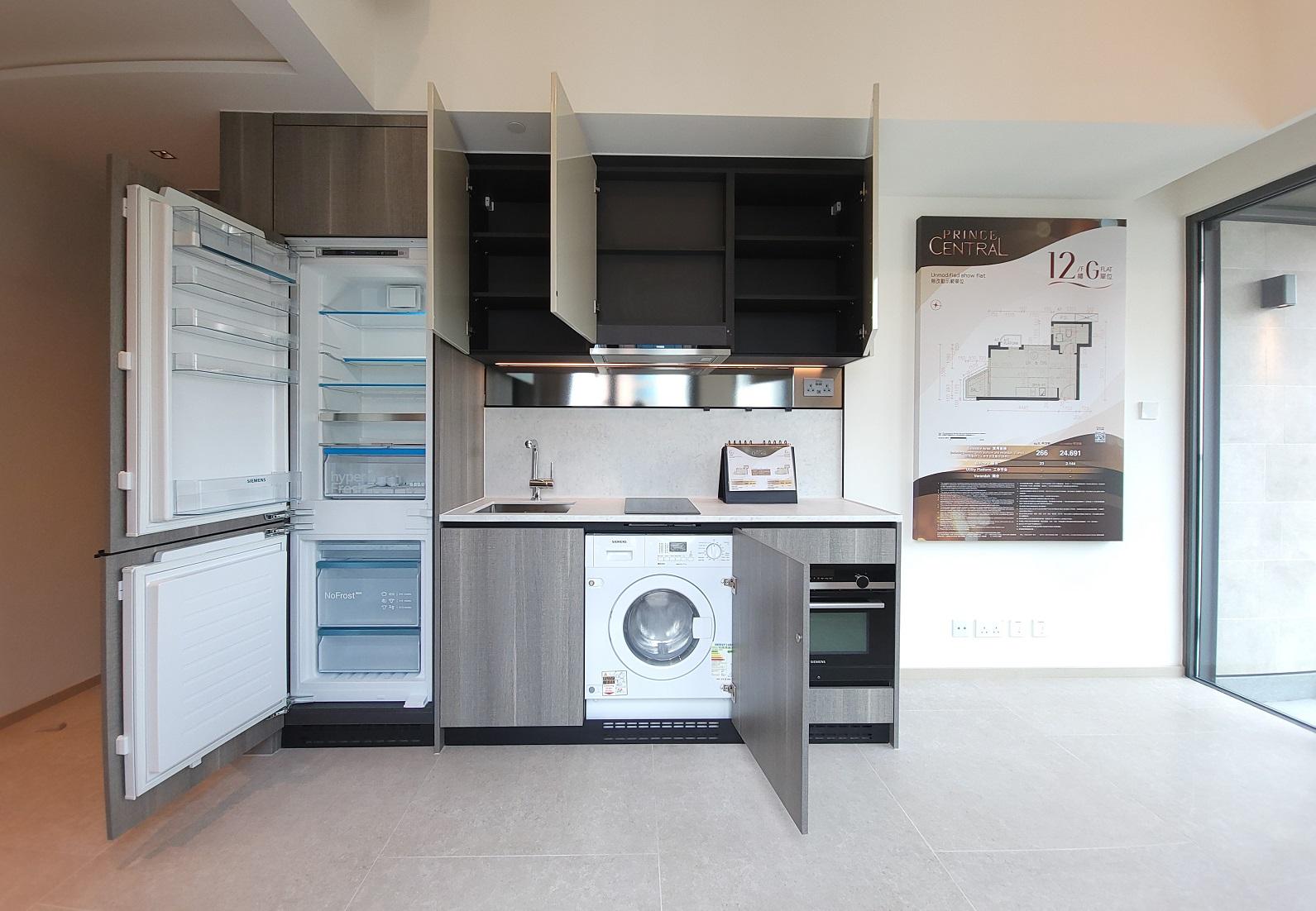 此外,12樓G單位屬開放式間隔,實用面積266方呎,客飯廳呈長方形布局,連接23方呎露台,配上落地玻璃趟門設計。開放式廚房設計,配備德國品牌電器,雪櫃連冰箱及洗衣/乾衣機更裝嵌於貯物櫃中,令空間更為優雅一致,亦增添貯存及工作檯面空間。米色配木紋飾面的廚櫃,時尚簡潔,提供充裕收納空間予各式廚房用品。