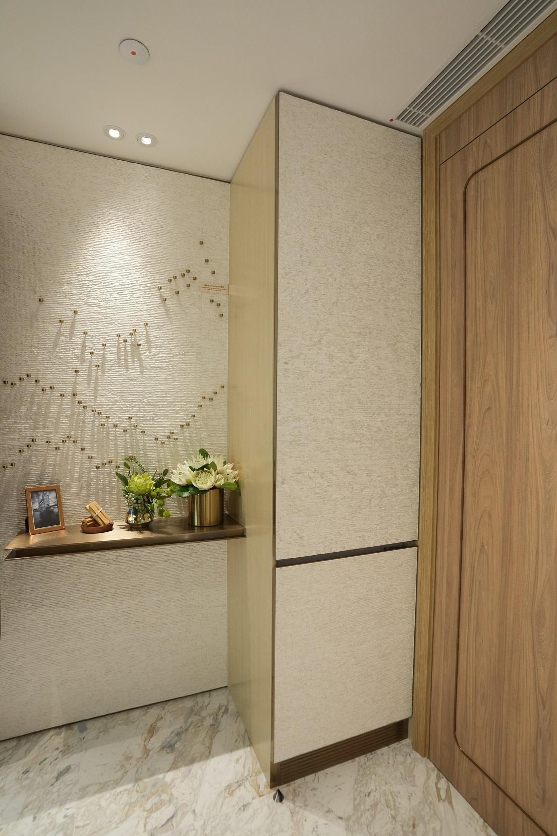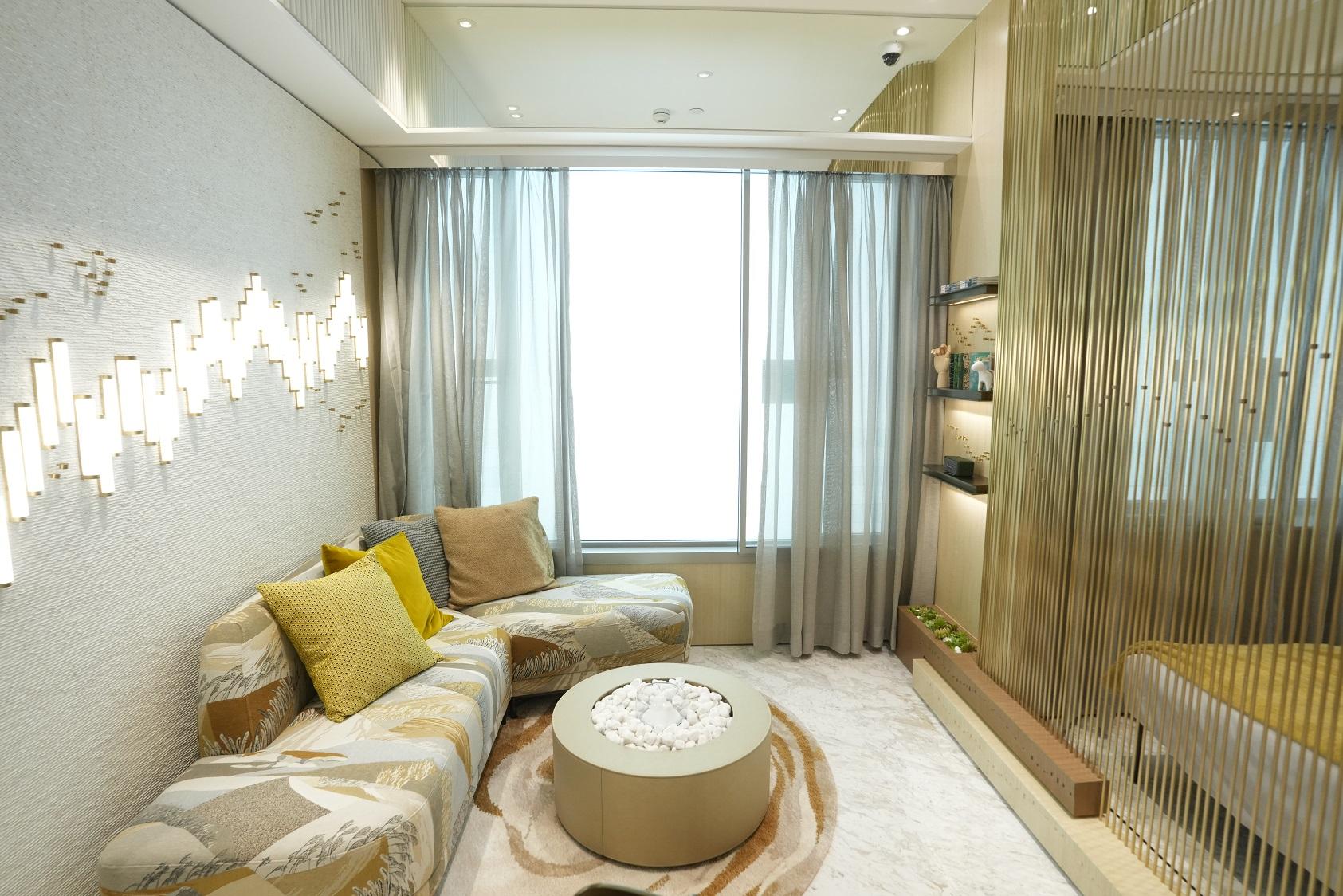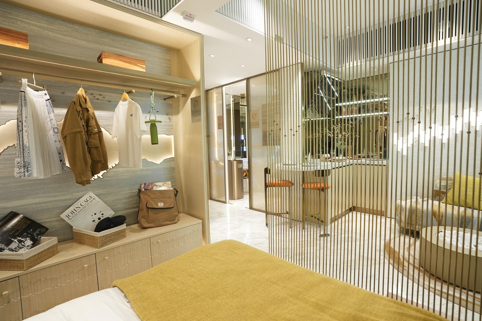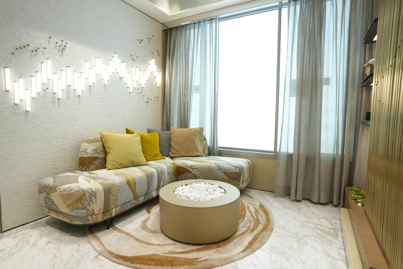 單位樓高3.15米,具充足的空間感,設計概念屬「輕奢山系風格」,由於項目面向大自然,整個經改動示範單位設計以淺啡色為基調,以天然雲石及金屬材質互相配搭,營造年輕和奢華的感覺外,又能盡顯大自然帶來的舒態。