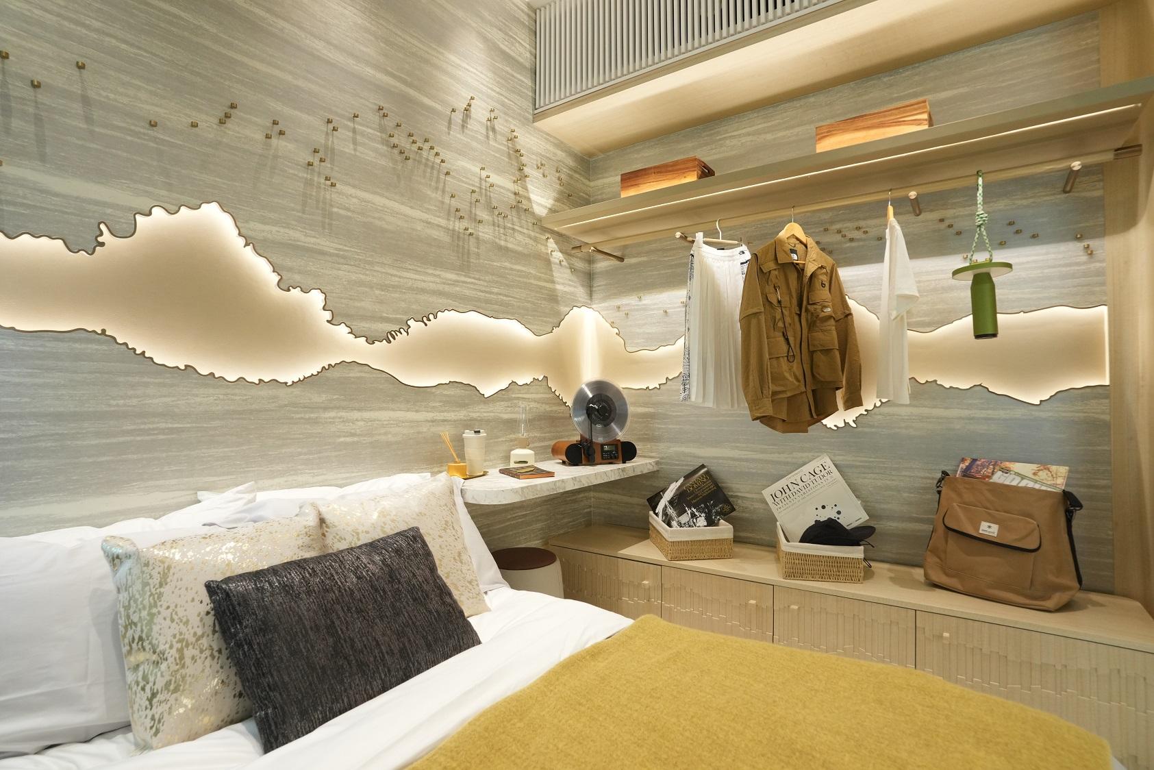 客飯廳與睡房間隔以金屬特色條子牆身貫通,配搭客廳以抽象山形圖案作構思的壁燈,視覺效果豐富。睡房設有開放式衣櫃,方便住戶收納衣物;床頭及衣櫃位置以發光山紋圖案捫布牆身貫通。地台延續客飯廳的天然雲石鋪砌,更能增加空間的一體性,並配合大幅玻璃觀景窗設計,與客飯廳一樣可享翠綠景致。