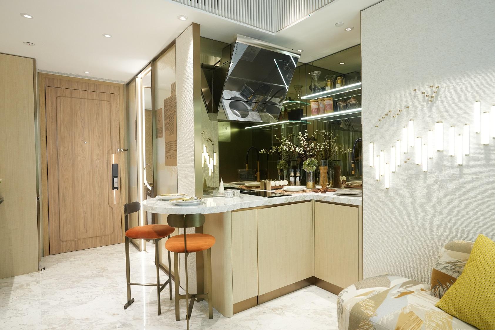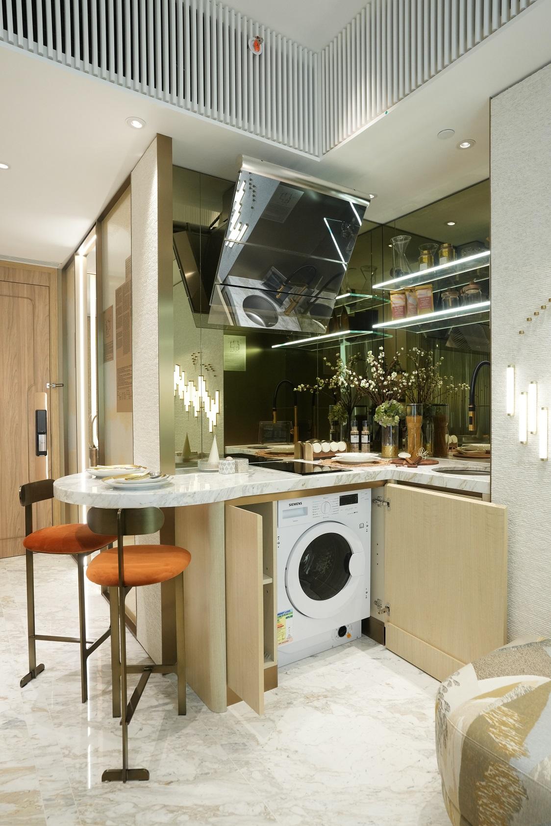 開放式廚房延伸出二人餐枱,猶如「小型吧枱」別具特色,亦減省擺放餐枱地方,騰出更多活動空間,並增加備餐空間;而雪櫃設於近門口位置,廚房位置配備電磁爐、洗衣乾衣機及玻璃鏡面的抽油煙機。