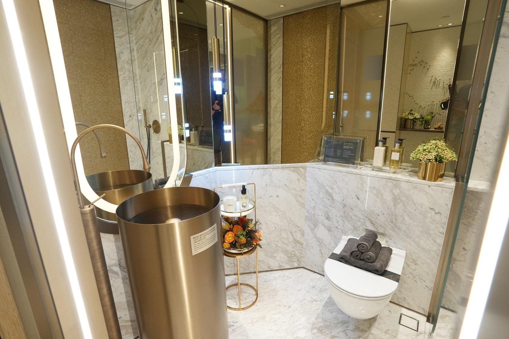 浴室方面,洗手盆採坐地式設計,牆身主要以黃白色天然雲石配以香檳金鏡及金屬制紙皮石舖砌,牆身設多塊鏡面,取代傳統瓷磚設計,方便住戶出門前整理儀容。