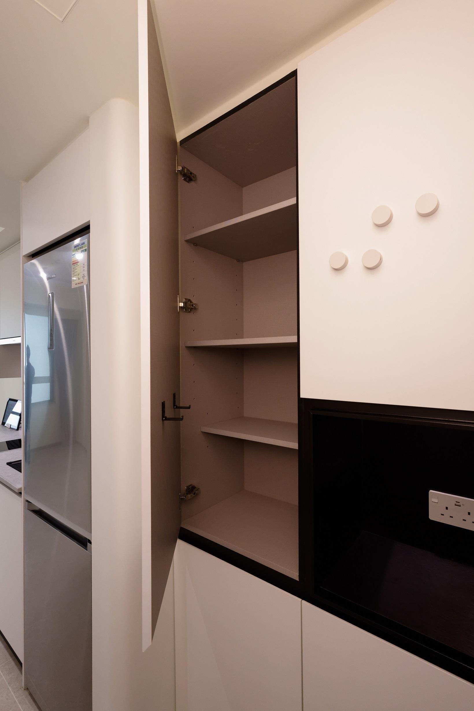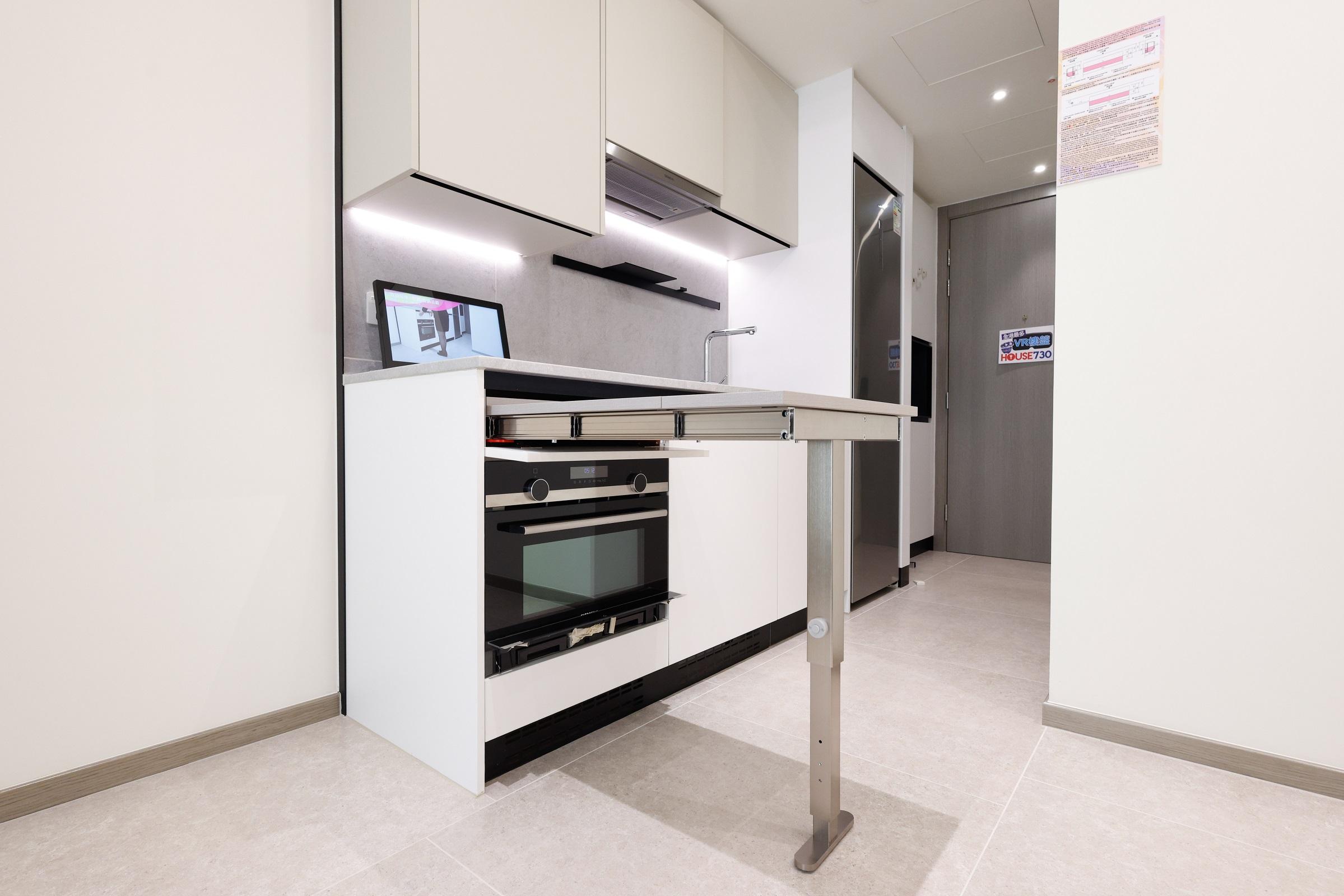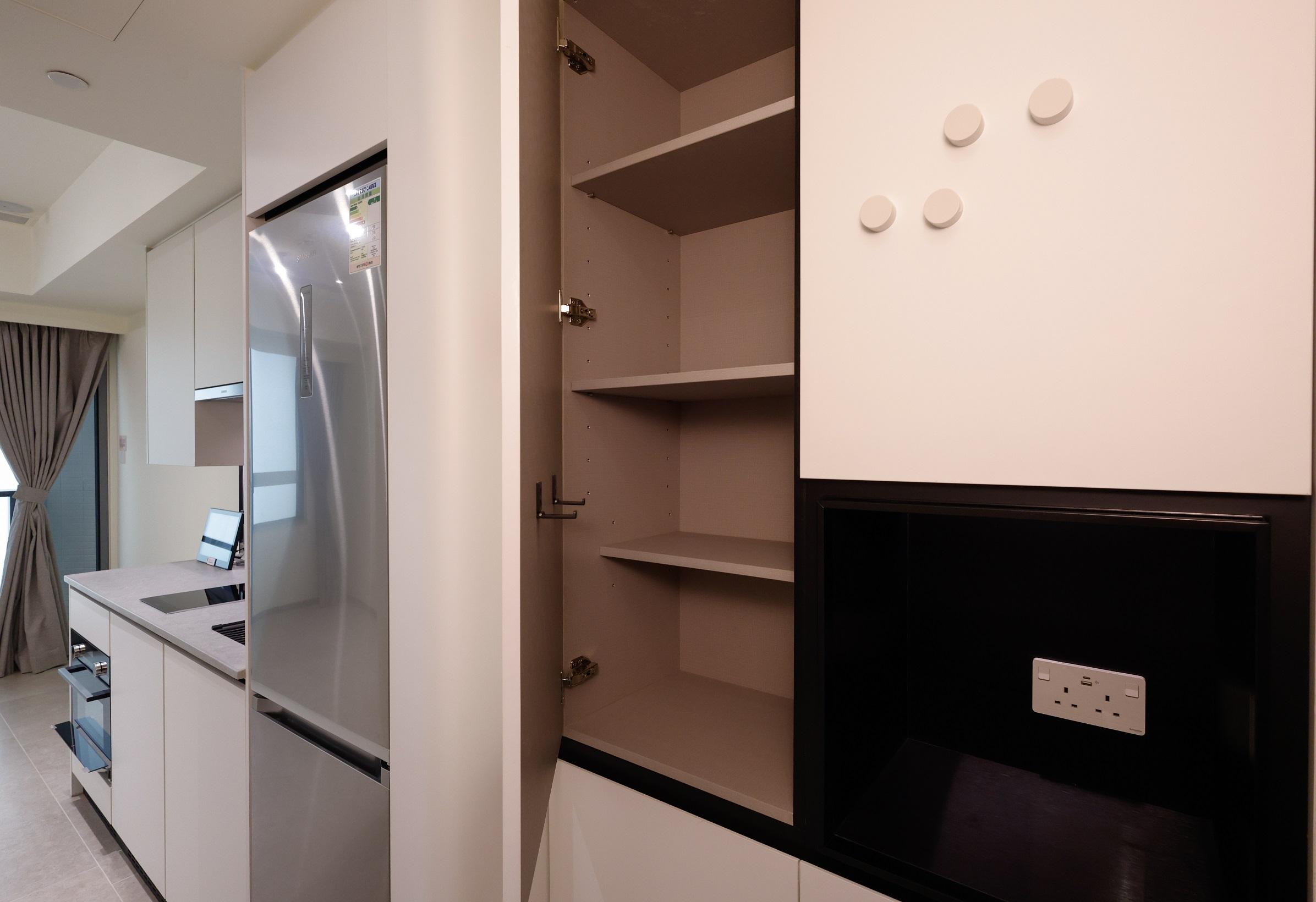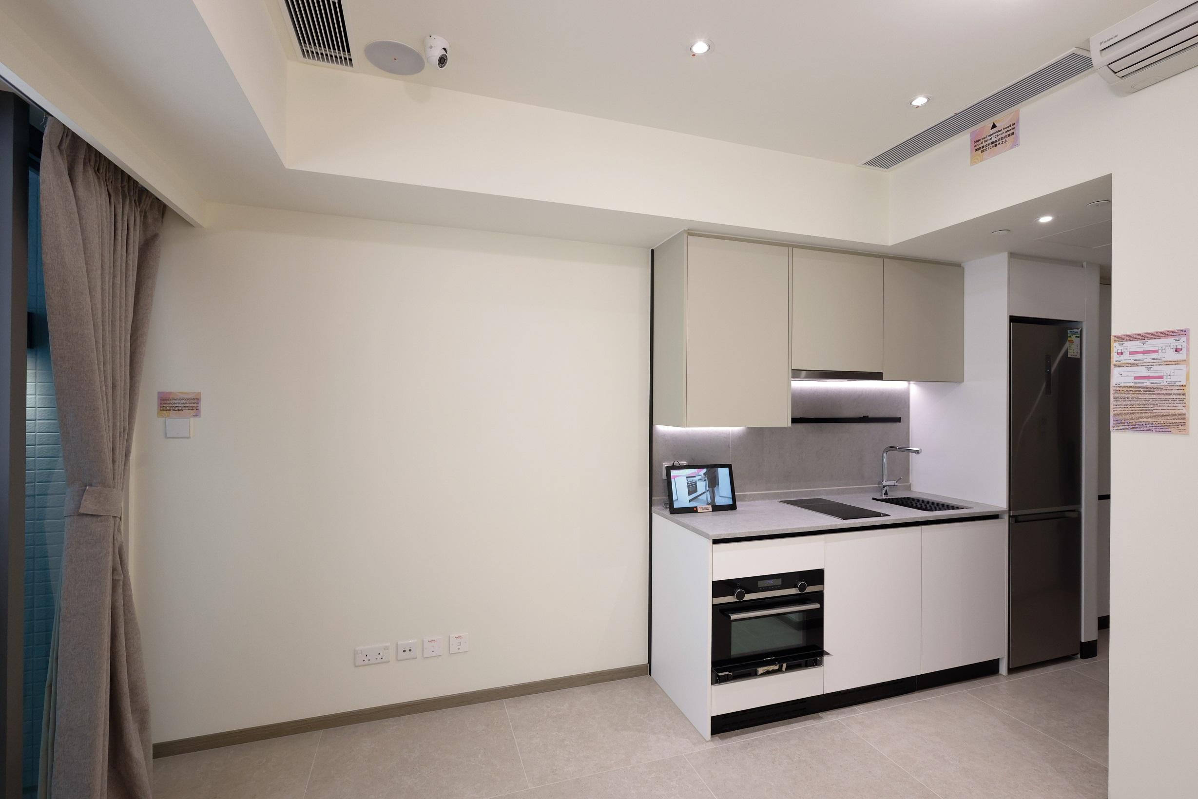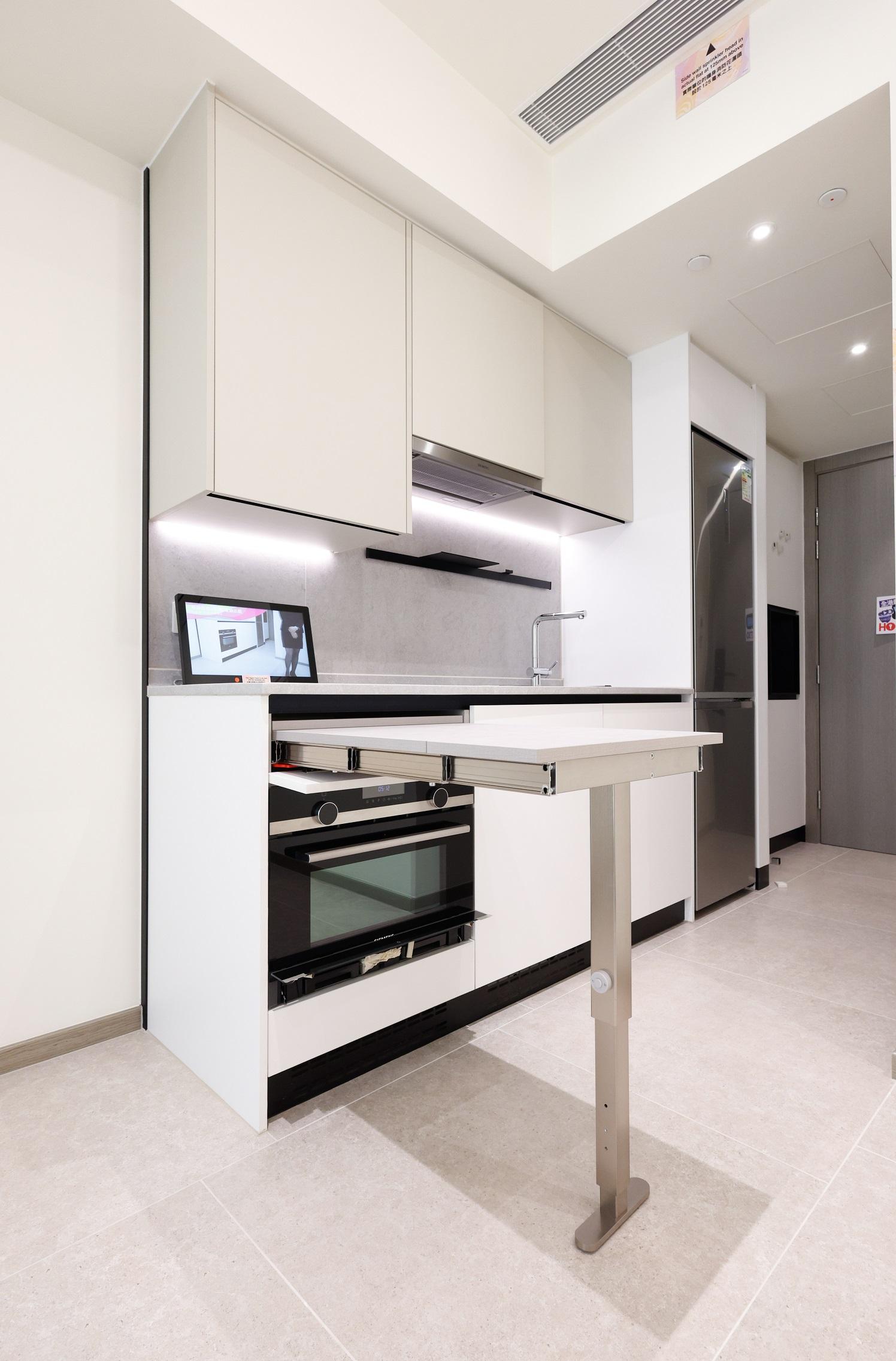單位呈長方形設計,空間實用。開放式廚房設計,配襯高雅象牙白色及淡灰色廚櫃,底部加設隱藏式抽屜,同時廚櫃內設收納式摺疊餐桌,用餐時住戶拉出淺灰色餐桌,放置椅子後,即變成用餐區。洗滌盤更貼心配備疏水卷軸,方便住戶作瀝水之用。廚房配備精選一系列專業廚房家電組合,包括Siemens七合一微蒸烤焗爐、抽油煙機及電磁爐;Samsung雪櫃;Whirlpool洗衣乾衣機,皆為嵌入式設計,令空間更為優雅一致。此外,客飯廳更安裝遮光布藝窗簾,貼心實用。