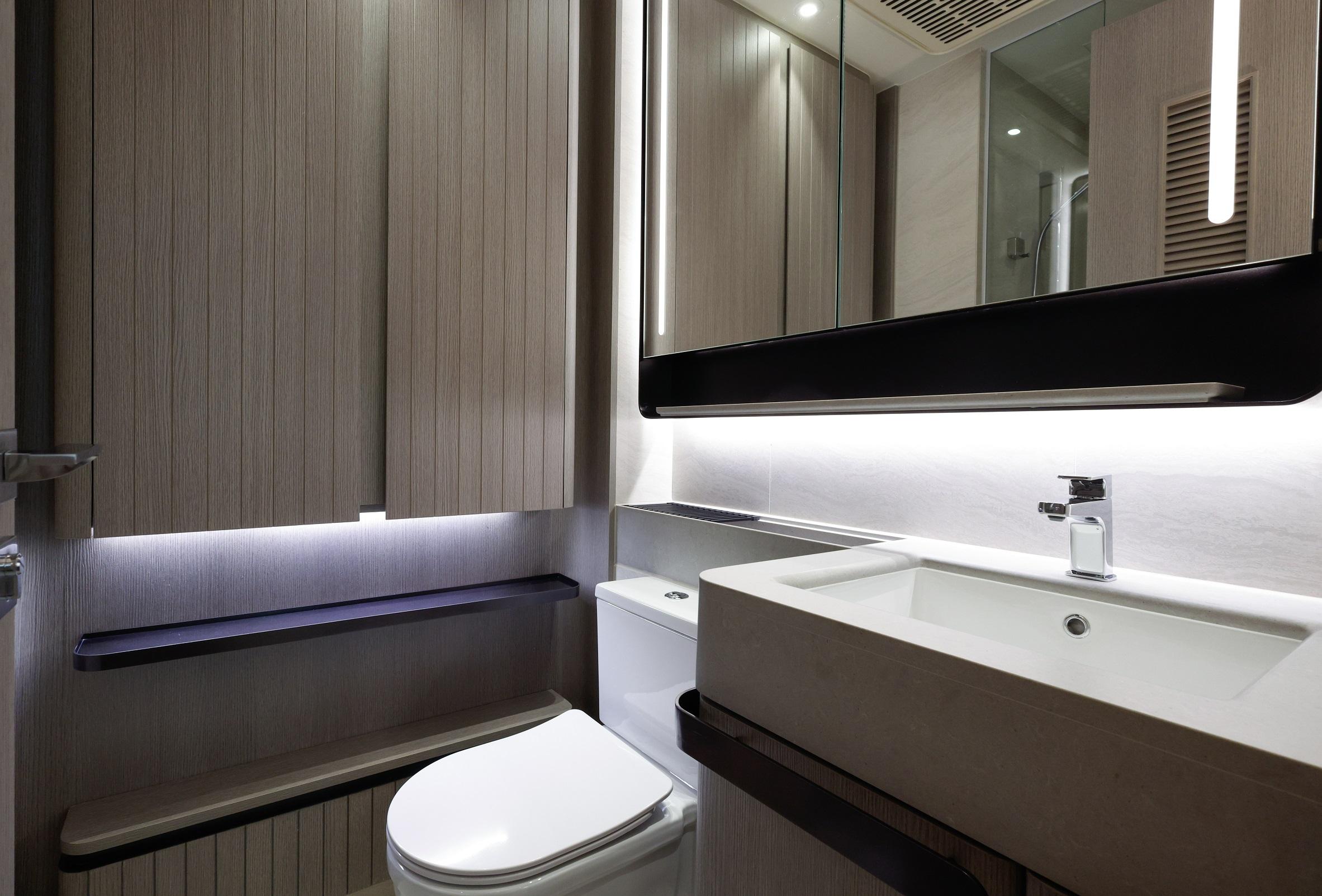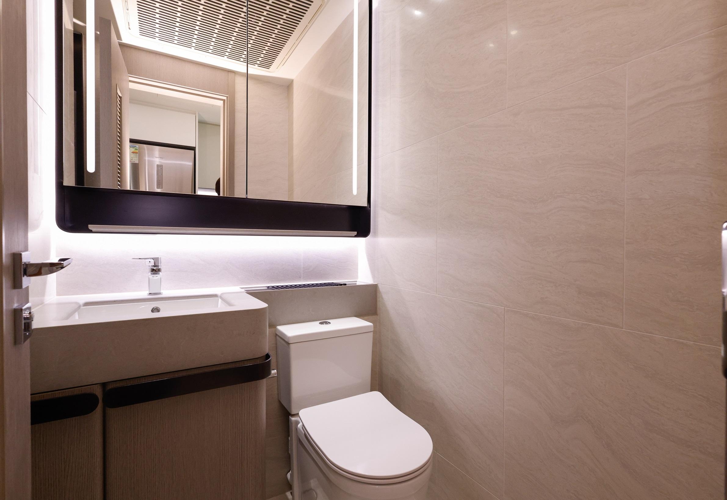 浴室牆身設計色調自然淡雅,配備三件頭浴室配備,包括淋浴間、洗手盆及坐廁,更設置具有暖風及空氣消毒功能之抽濕機。浴室置物空間充裕,設有洗手盆櫃及鏡櫃,供住戶放置洗滌用品,更配備酒店式可伸縮晾衣繩。