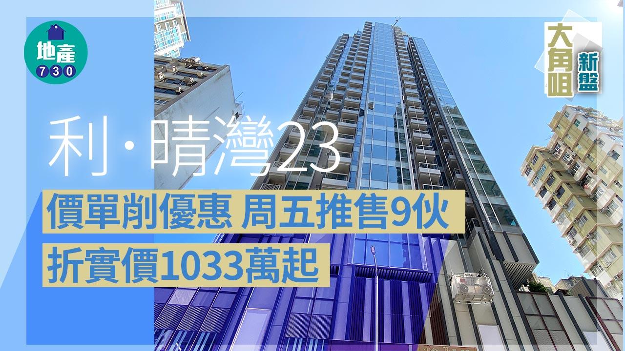 主打細單位、有利集團(406)與市區重建局合作發展的大角咀單幢式現樓新盤利.晴灣23今日(1日)更新價單,原有120天現金優惠付款計劃提供5.75%折扣,最新折扣降至4.25%,同時取消「早鳥折扣」的1%折扣優惠。