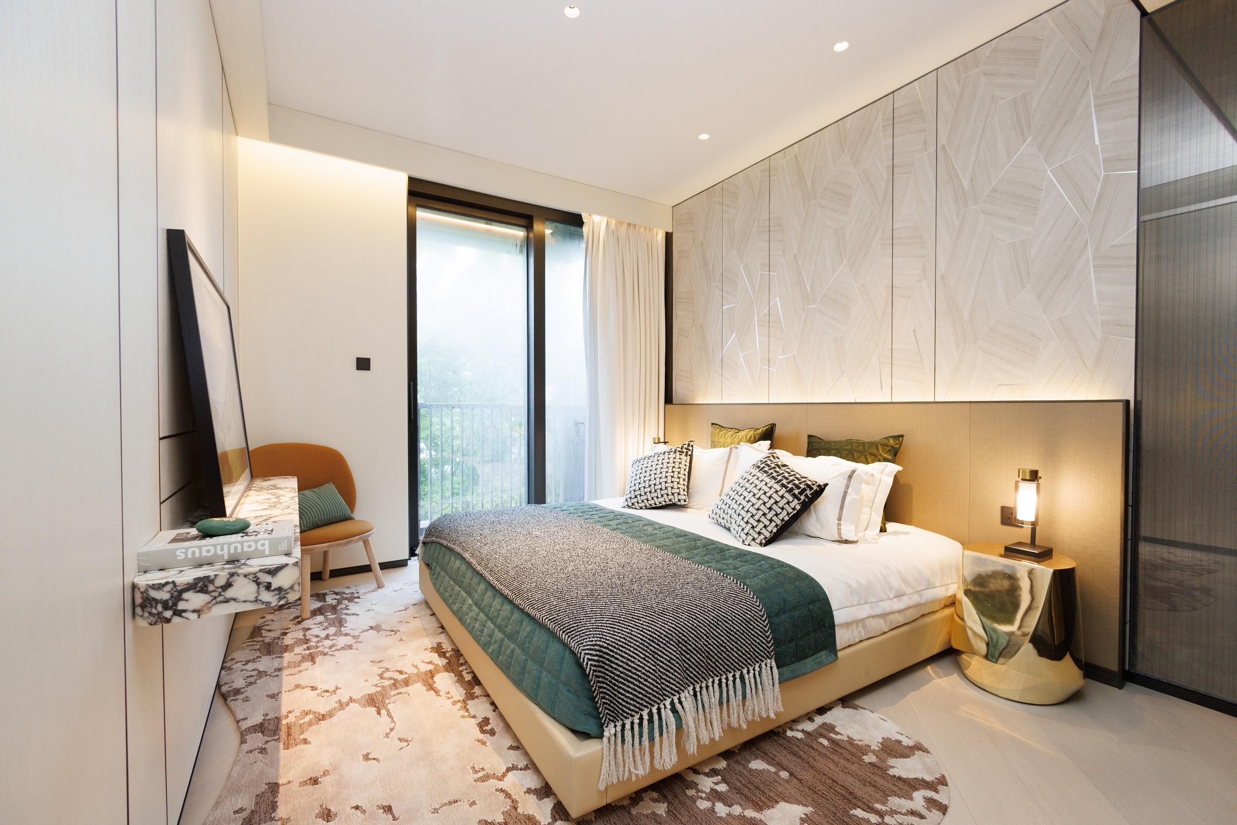 主人房長約4.5米、闊約3.4米,空間逾150方呎,擺放床架及衣櫃後仍可三邊落床。落地玻璃大窗外接工作平台,增加通風採光。主人浴室採明廁設計,特設雙面盆及大浴缸。