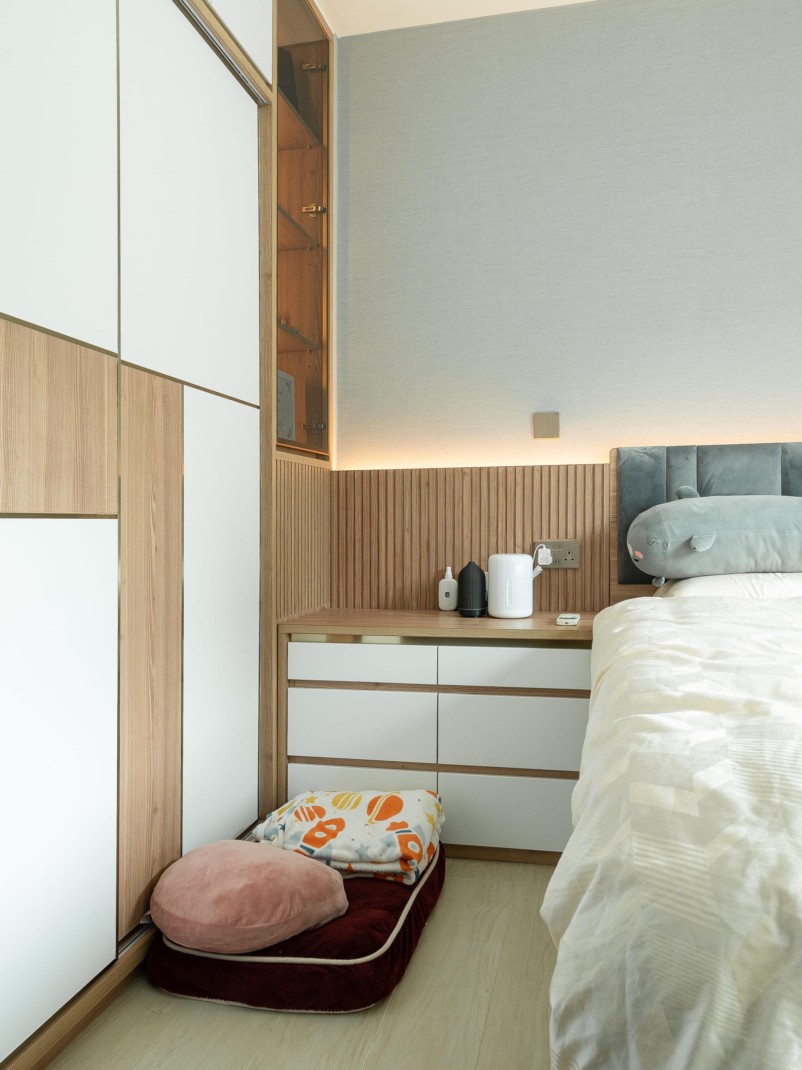 主人睡房亦沿用簡約設計,造了一組高身衣櫃,床頭用木條子做裝飾,而顏色上用了白、灰及木色永不過時的配搭,已經十分有格調品味。