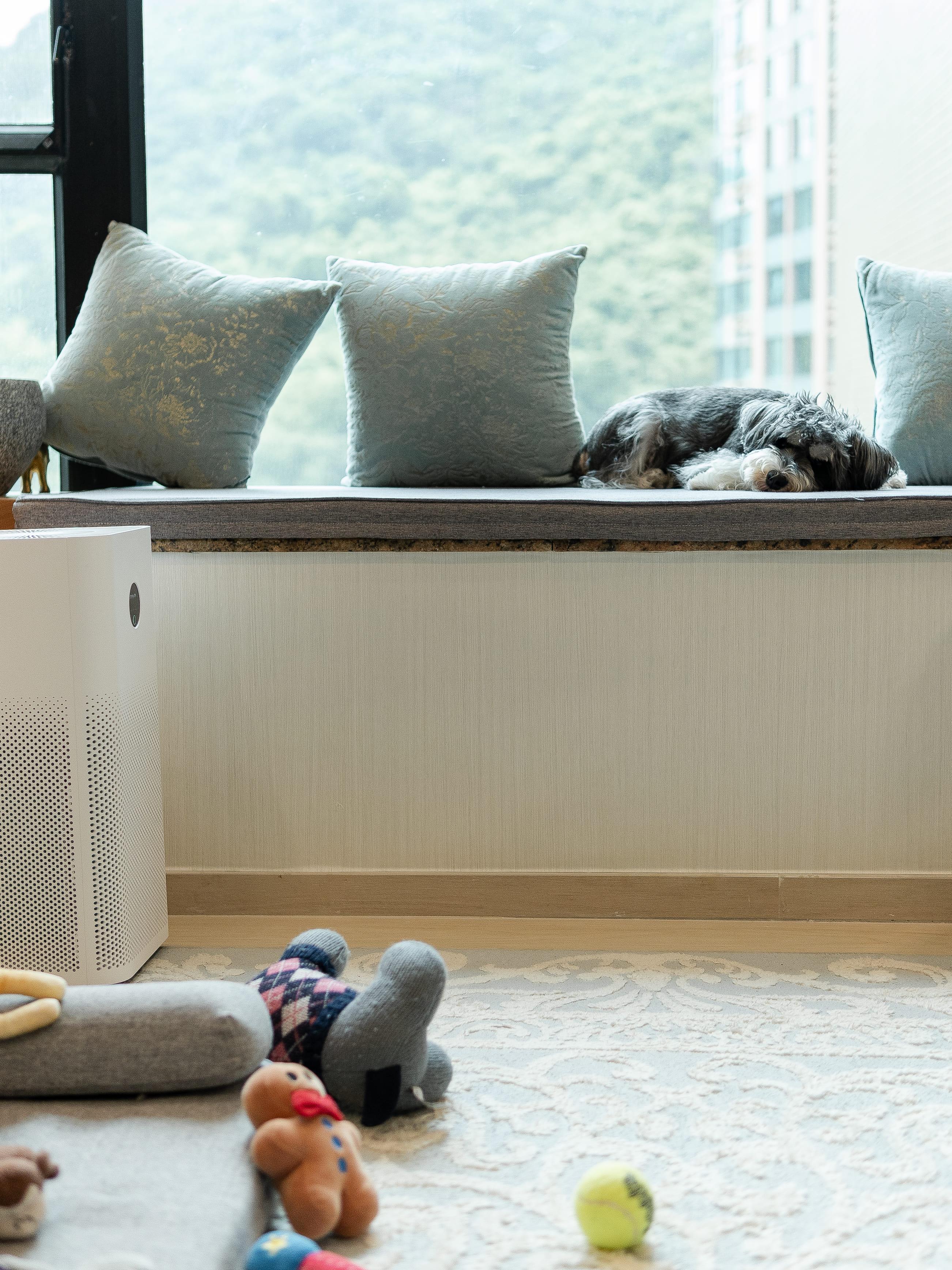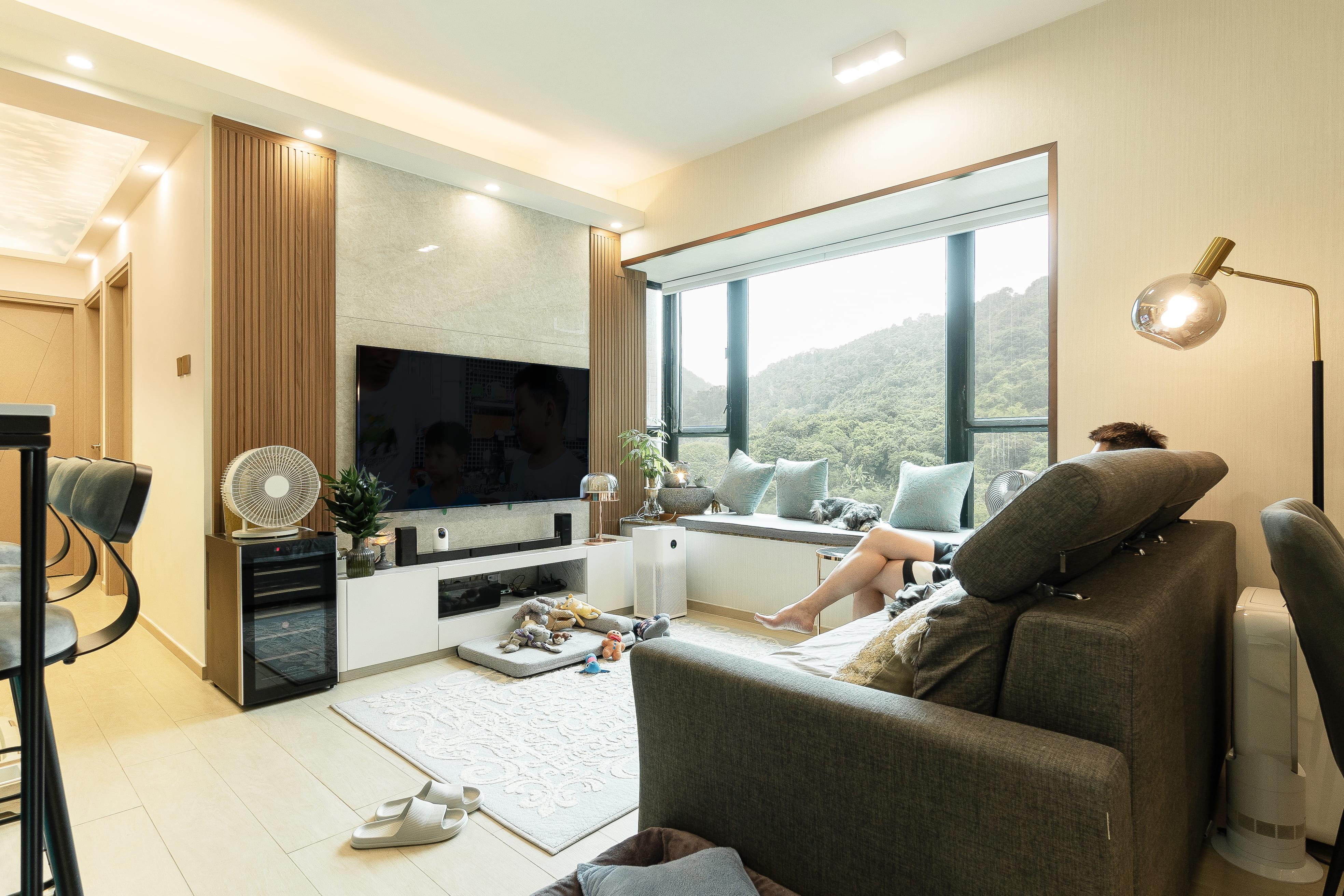 戶主喜歡簡約的設計元素,電視櫃下方造了一個矮櫃,牆身兩側就用了木條子的元素,帶點日式味道之外又不會過份單調,窗台位置除了放了綠色盆栽還有坐墊,除了有裝飾的用途外,亦令自己可以閒時可以望窗外的山景,放鬆心情,偶爾亦變成了愛狗的睡床。