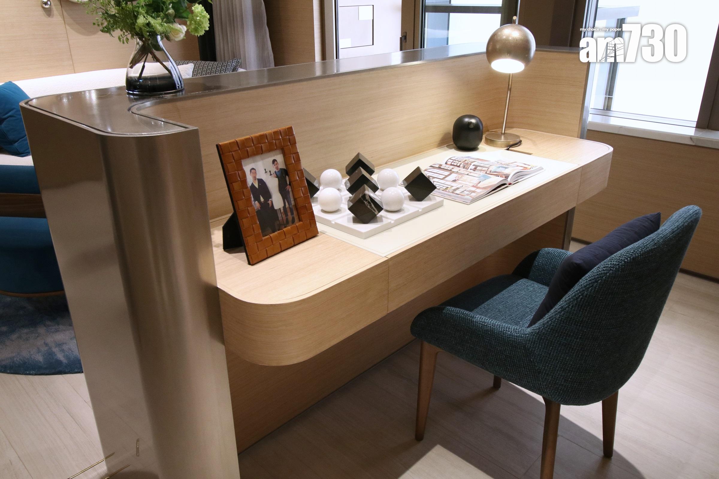 設計師更為配合新世代家居工作所需,於大廳設有開放式工作空間,可隨時欣賞超廣闊維港海景。主人房與大廳同向,可享維港海景。浴室備有高級衛浴設施,搭配圓鏡面馬賽克瓷磚。