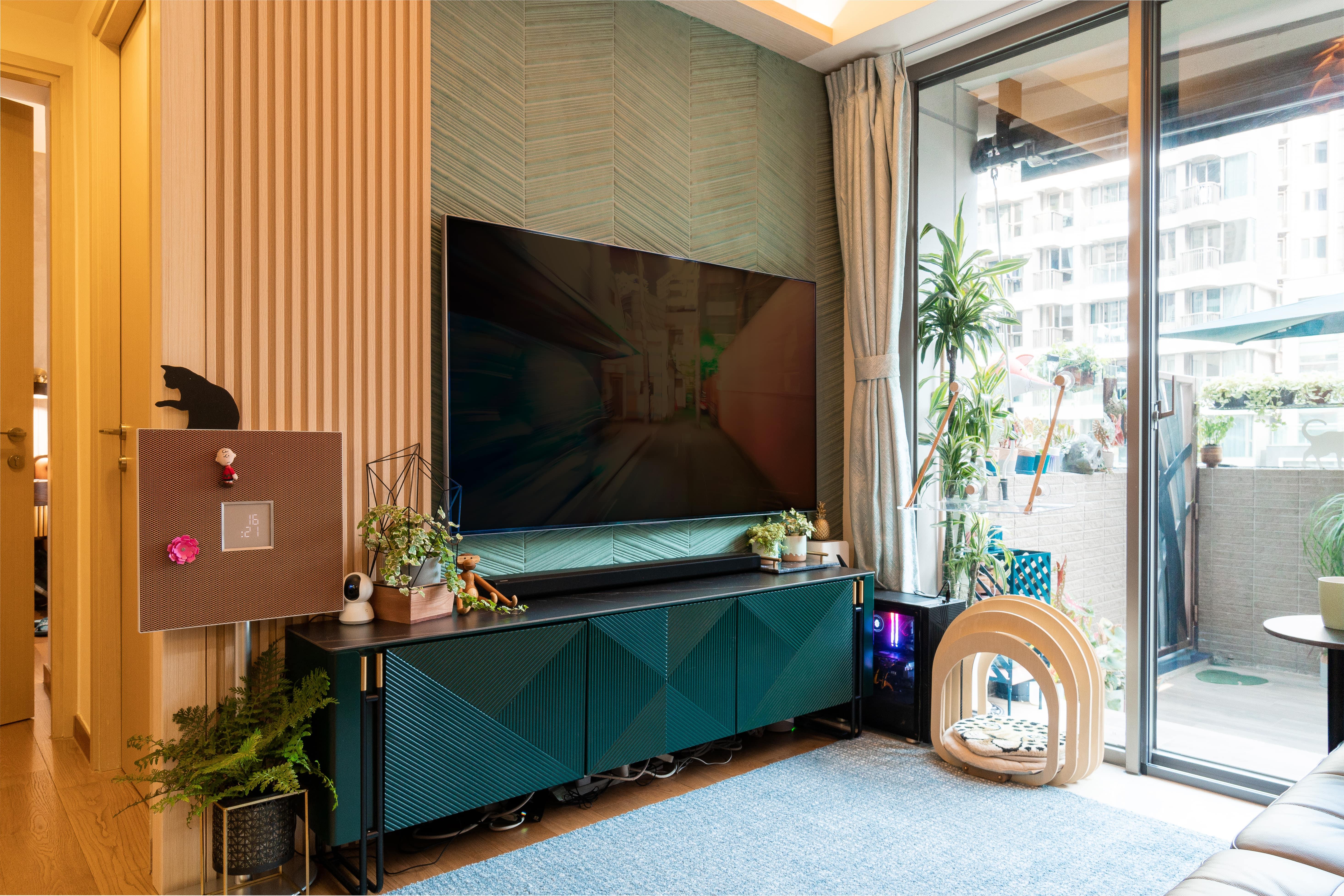戶主喜歡大自然,所以用了很多綠色的元素,給人一種很清新、自然的感覺。每天工作都已經很辛苦,回到家中都希望能夠放鬆自己,今次單位客廳用了樹葉紋的作為特色牆, 綠色令人感覺放鬆及舒服,而牆身的材質亦非常有質感,跟墨綠色電視地櫃十分相襯。