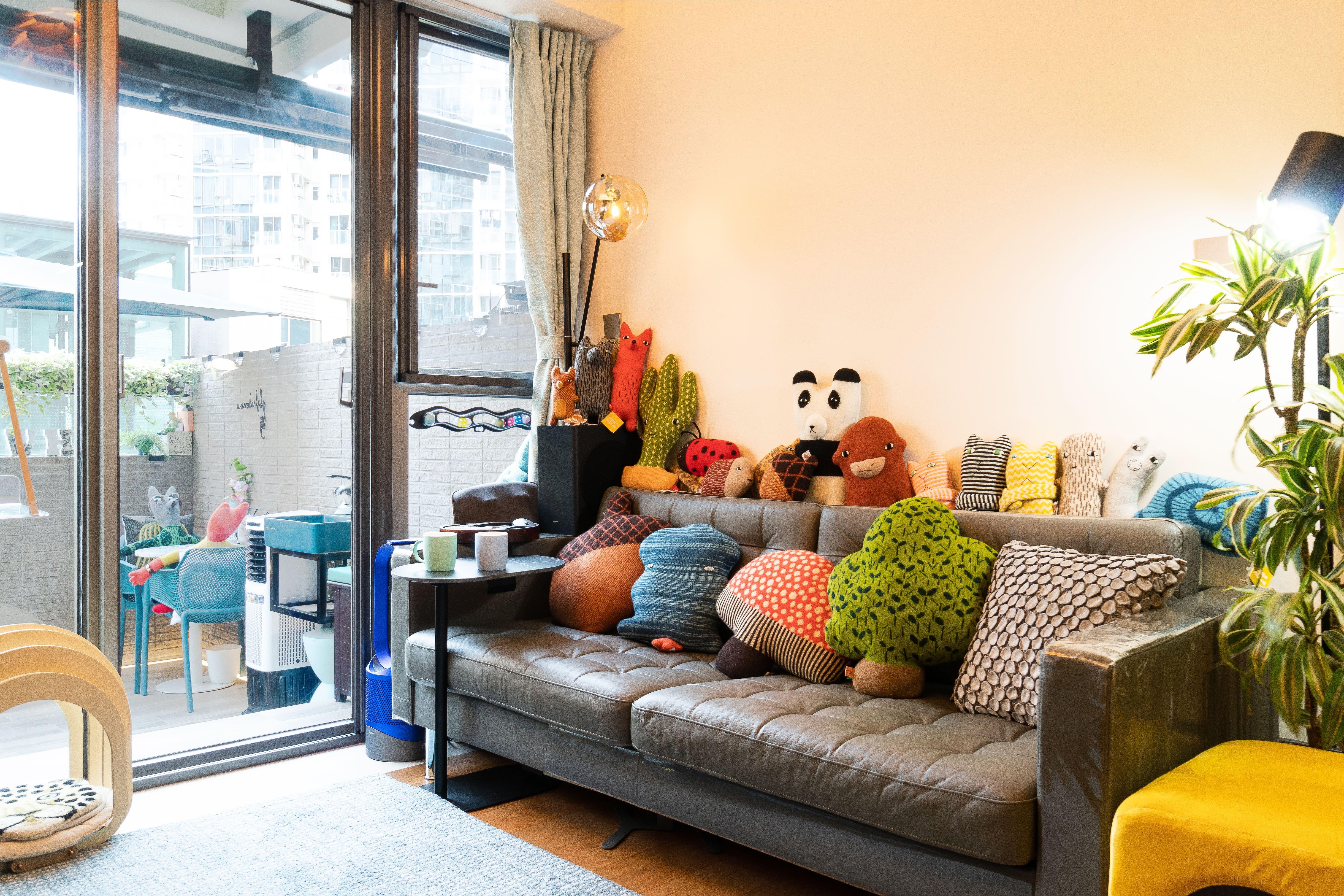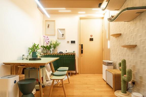 戶主養了一隻貓,客廳造了貓爬架及跳台,變成了愛貓的小天地,就連爬架都用了綠色的元素,統一全屋的用色風格,而很多細節的位置上,亦看出戶主的用心,例如客廳的檯腳,都加了貓抓柱,可見處處為愛貓著上。