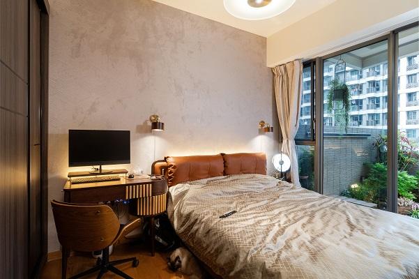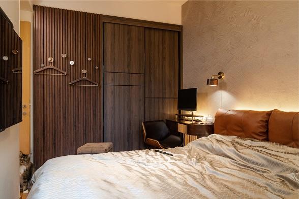 至於睡房空間就用了較沉穩的深木色,給人一種寧靜舒適的感覺,細節位加點金色及雲石紋作為襯托,散發典雅高貴的感覺。