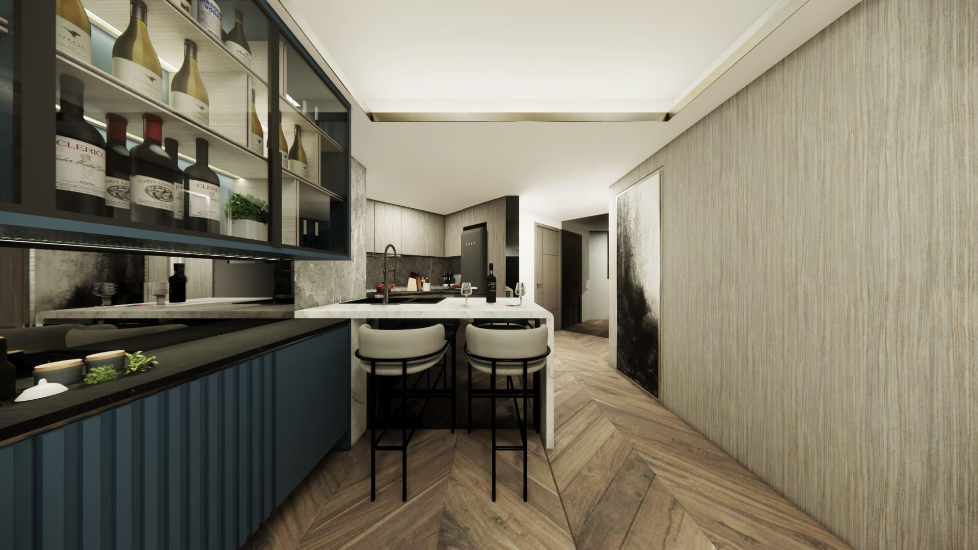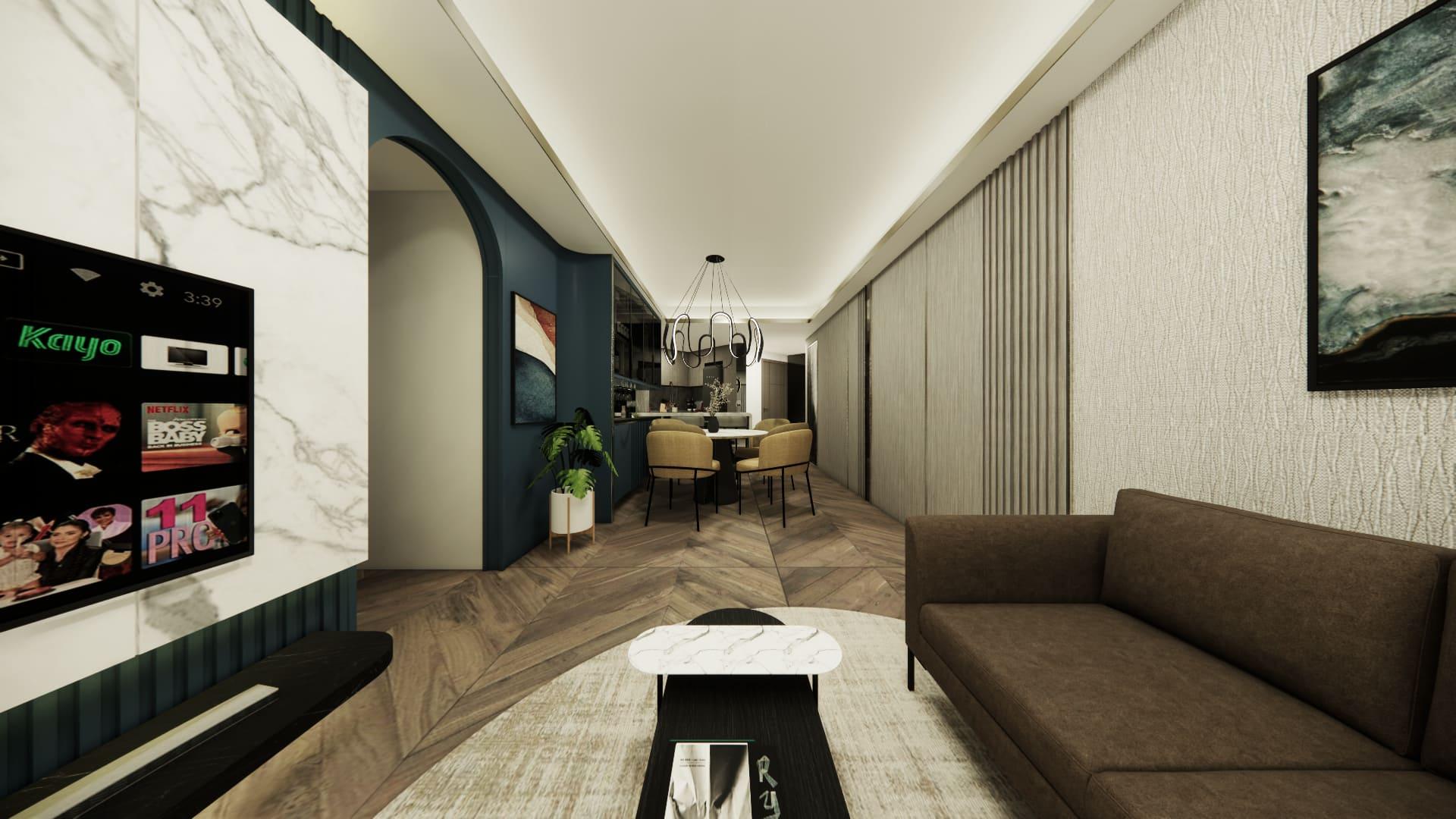 而設計師以霧藍色作為一屋的主色調,再以白色及大地色作為配搭,襯出極具格調的家居,而地板選用了木紋地板,充滿自然的質感,地板的鋪法以魚骨形狀鋪設,令視覺效果更加窗出,十分搶眼吸睛。圓弧形、曲面的傢俬,往往會令單位更具和諧及輕盈感,設計師就以圓弧形的設計修飾櫃身,更具現代感。客廳的電視牆身背板以雲石紋作紋理,令單位散發著典雅高貴的格調,而飯檯上的吊燈亦極具藝術感。