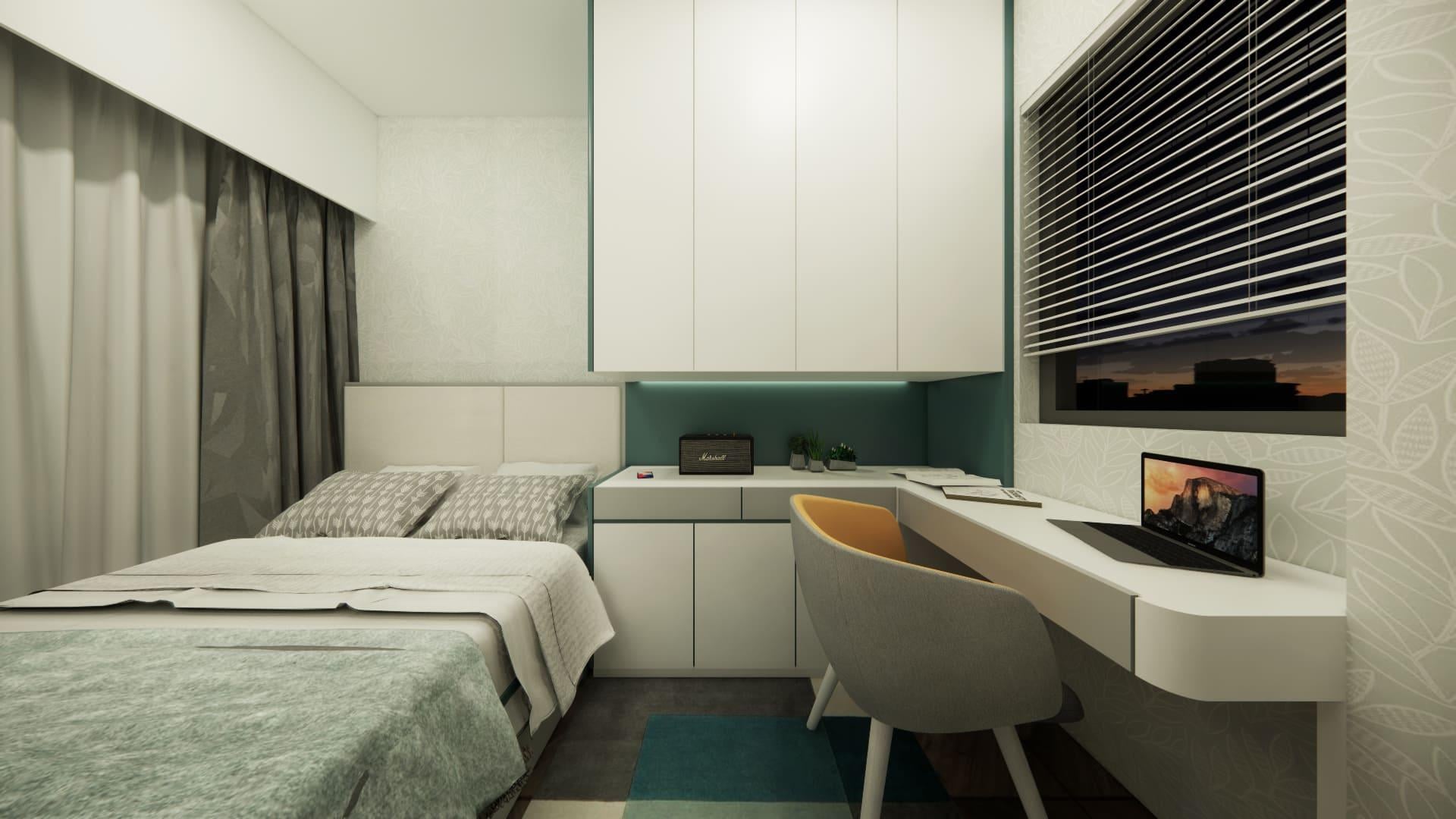 主人睡房屬套房間隔,用色及設計都貫徹全屋的風格,靠窗一邊擺放雙人睡床,以及一組到天花頂的衣櫃。至於另一間睡房就用了淡雅的綠色,增添活潑感,而書檯亦運用圓弧去修飾邊角。至於最後一間客房就改成書房用途,一邊作為工作檯的空間,另一邊就擺放衣櫃。