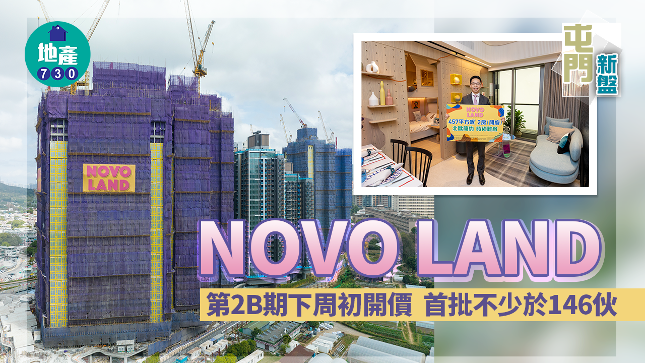 NOVO LAND位於屯門欣寶路8號,分6期發展,其中第2B期由兩座住宅大樓組成,提供729伙,採V型布局設計,位處整個發展項目的單邊。單位戶型涵蓋一房至四房,當中一房及兩房佔全盤近九成。項目預計關鍵日期為2024年5月17日,樓花期長約15個月。