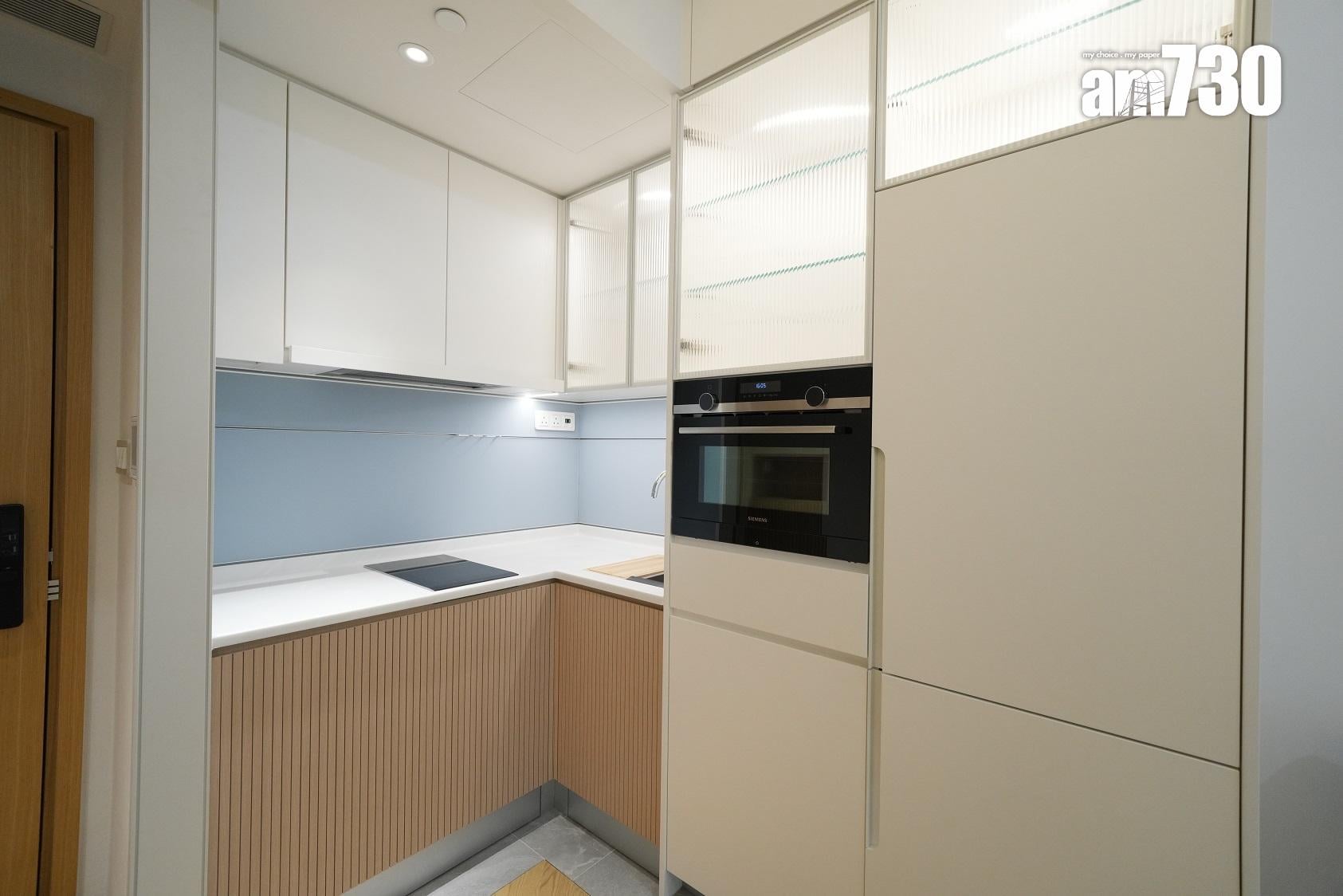 廚房採開放式設計,淺色系工作檯面與天藍色的牆身互相映襯,配以白色飾面及原木廚櫃。洗滌盤更附有隔水盆及砧板,方便住戶日常煮食。廚房家電配備齊全,包括德國品牌Siemens電磁爐、七合一微蒸烤焗爐、雪櫃、洗衣乾衣機及抽油煙機,並同時被整合到廚櫃之中,節省空間兼顯整潔歸一。