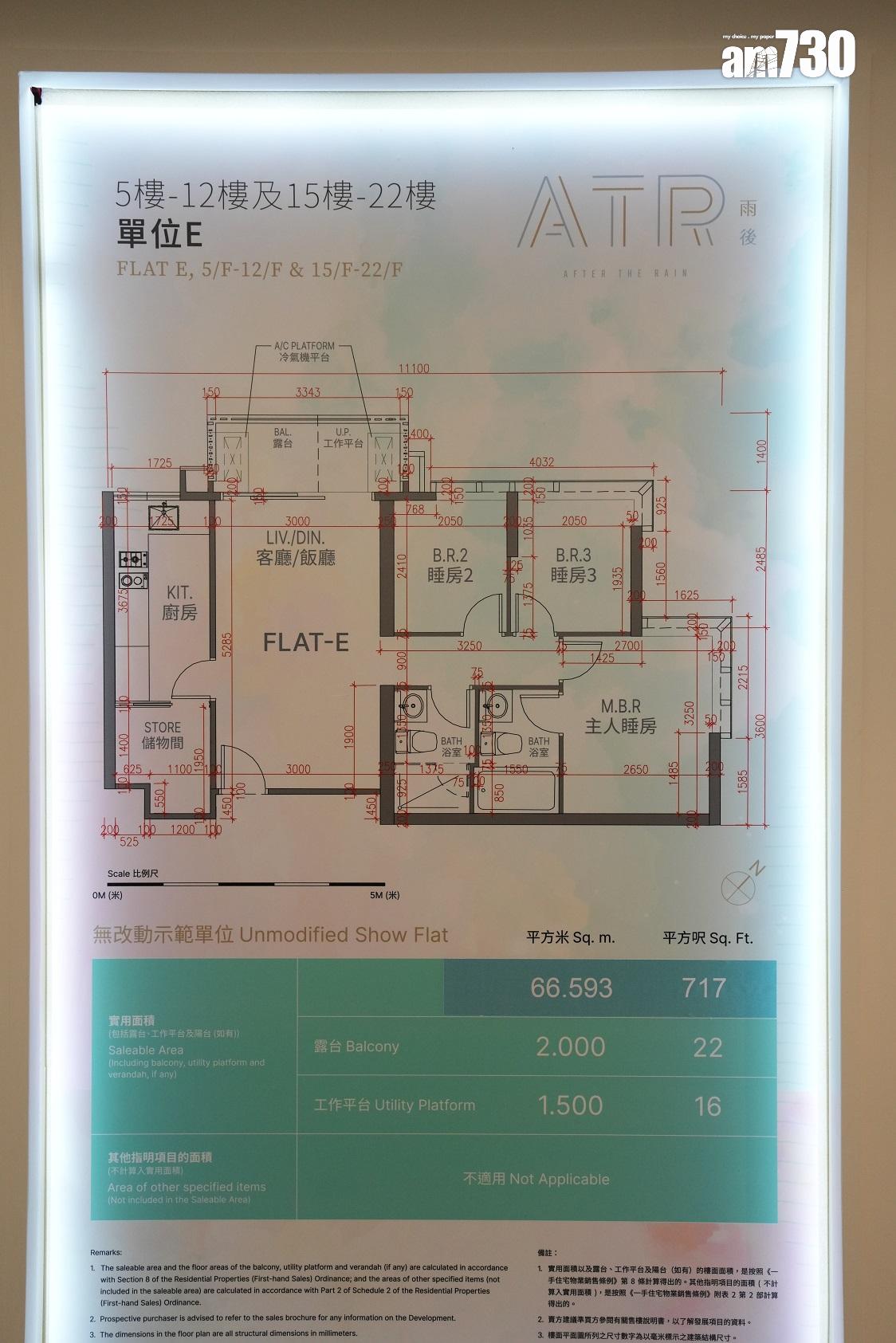 以22樓E室為藍本搭建的三房一套連儲物房示範單位,實用面積717方呎,22方呎的露台與16方呎的工作平台合拼成特大的戶外活動空間。單位間隔寬闊實用,切合年輕家庭住客的需要。客飯廳空間寬敞實用,以玻璃趟門設計連接室外空間,令客飯廳更顯寬敞明亮;長形設計可讓住戶可隨意放置各種大型傢俬。