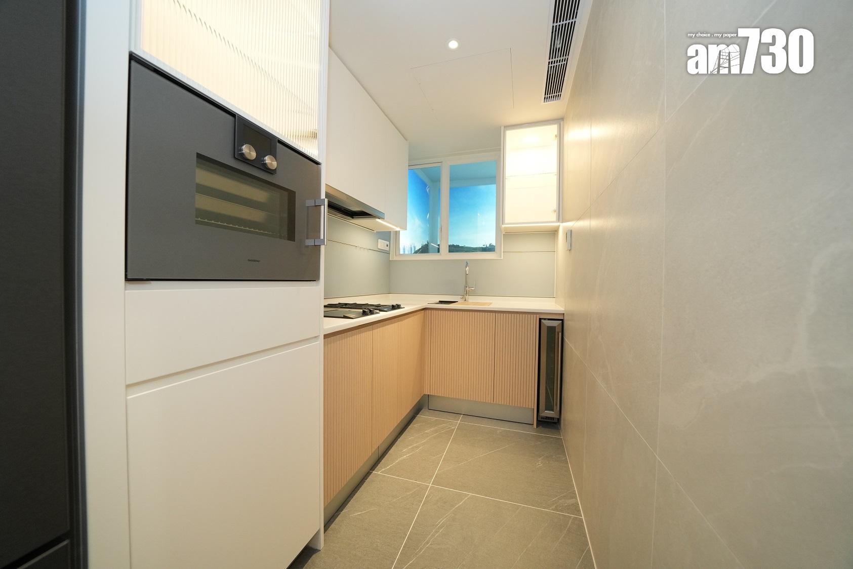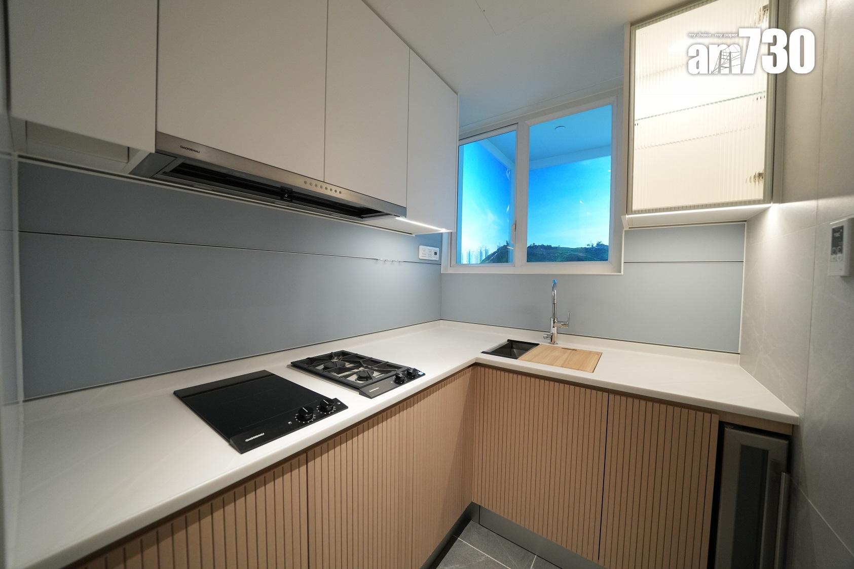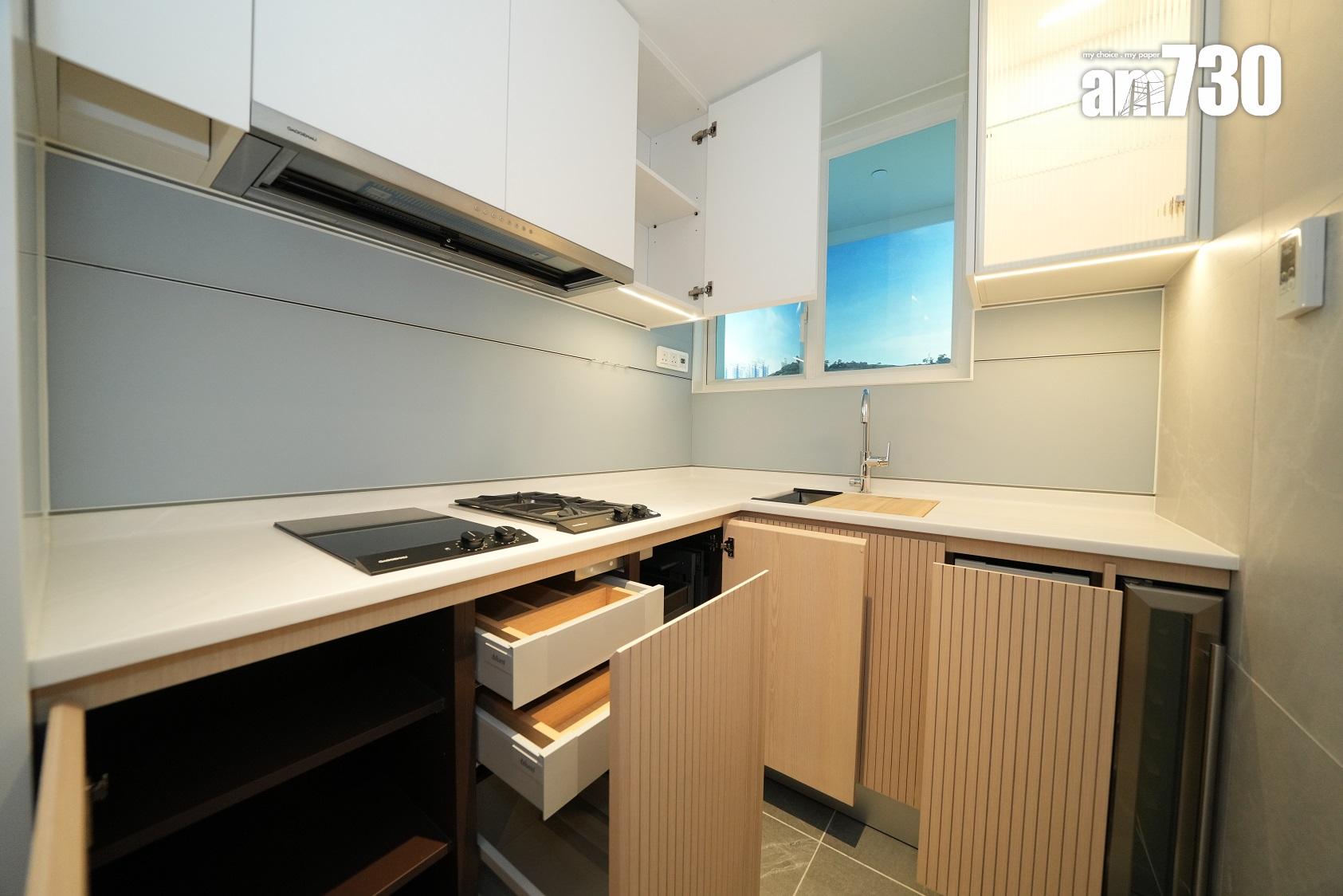 單位採用長形獨立廚房設計,設置淺色系L形工作檯面,洗滌盤更貼心配備隔水盆及砧板。廚房設置充裕的收納空間,廚櫃內置各式層板及間隔,方便住戶分類擺放廚具及餐具,更貼心備有兩個垃圾桶,鼓勵住戶實踐分類回收的綠色生活。