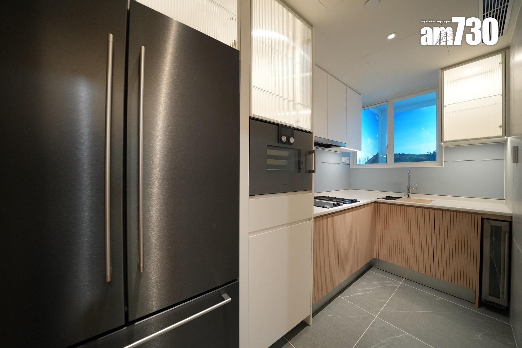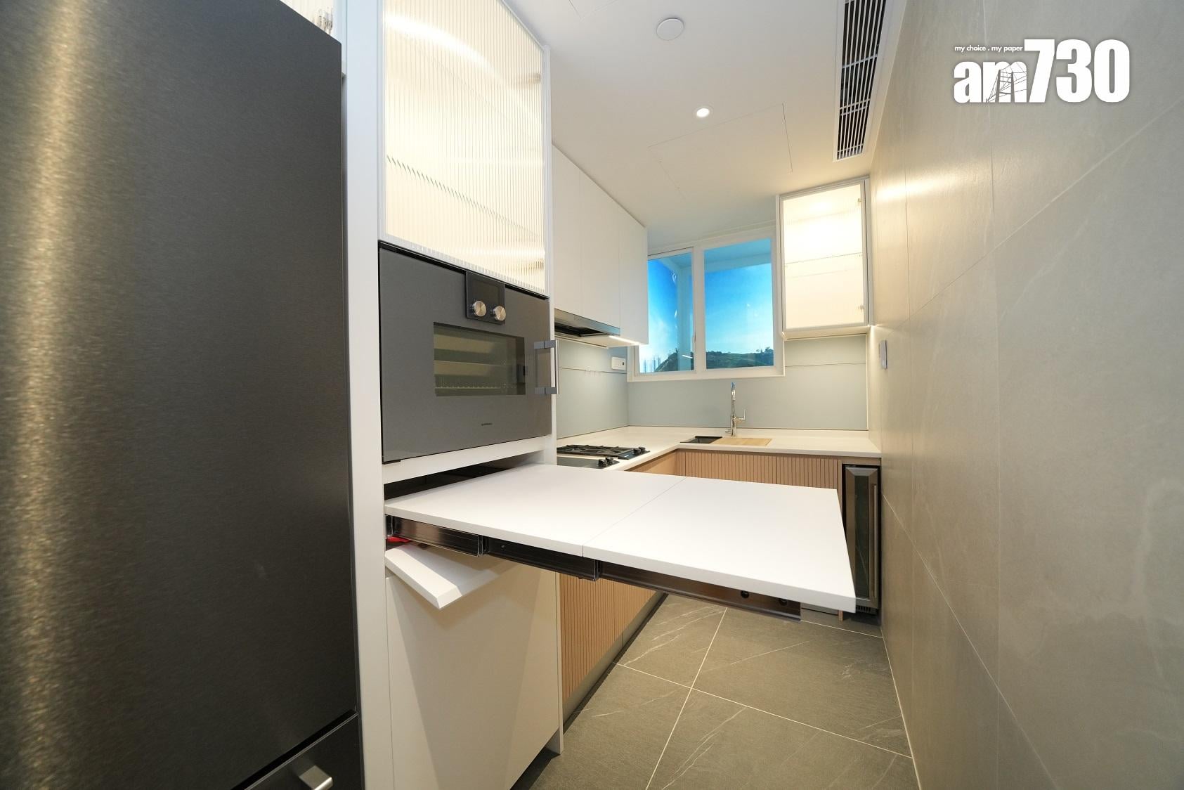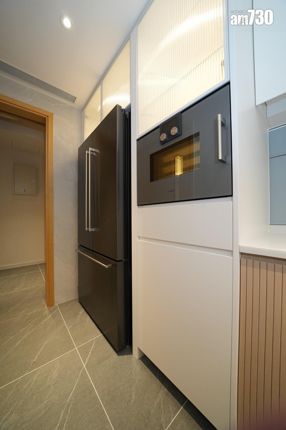 單位採用長形獨立廚房設計,設置淺色系L形工作檯面,洗滌盤更貼心配備隔水盆及砧板。廚房設置充裕的收納空間,廚櫃內置各式層板及間隔,方便住戶分類擺放廚具及餐具,更貼心備有兩個垃圾桶,鼓勵住戶實踐分類回收的綠色生活。