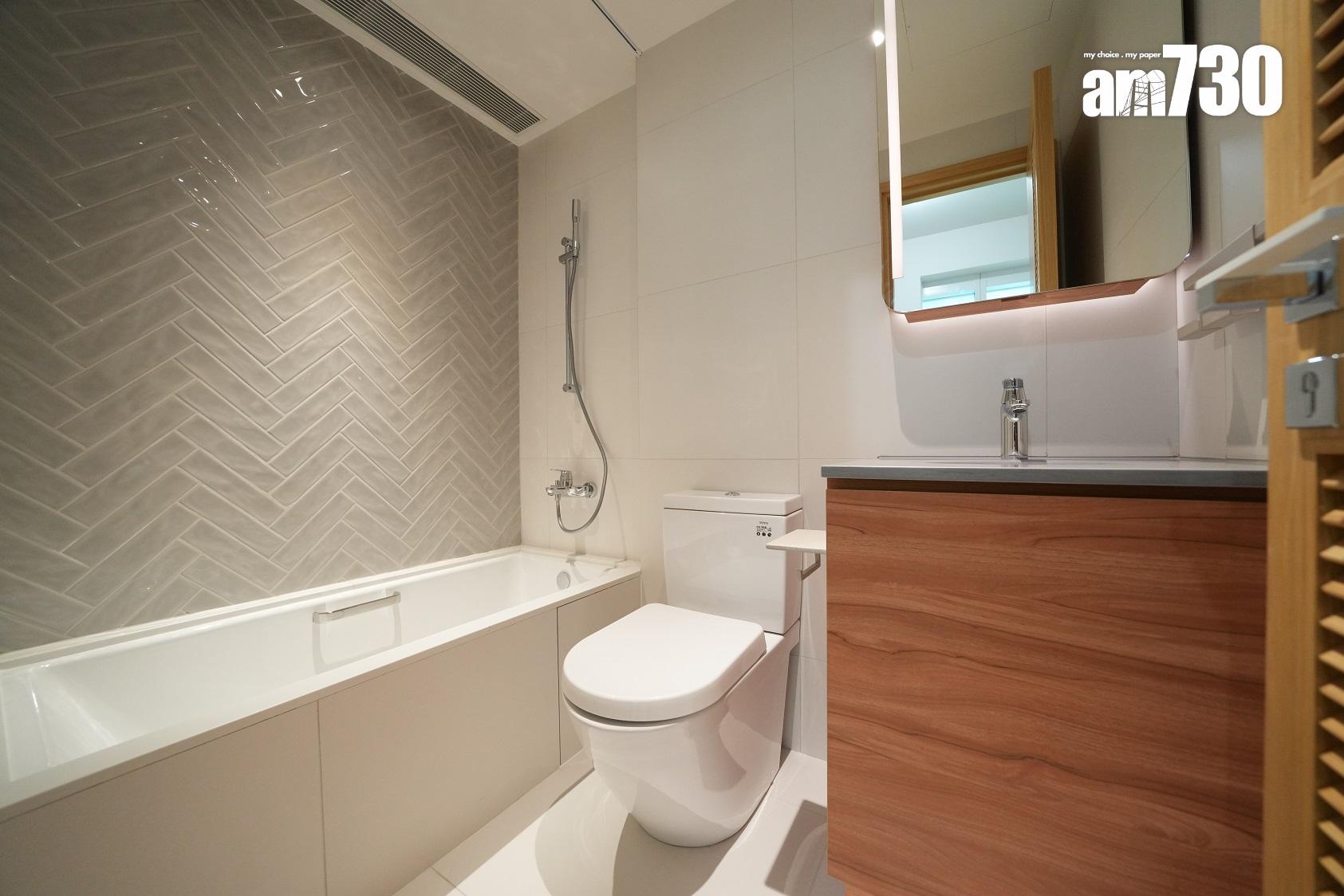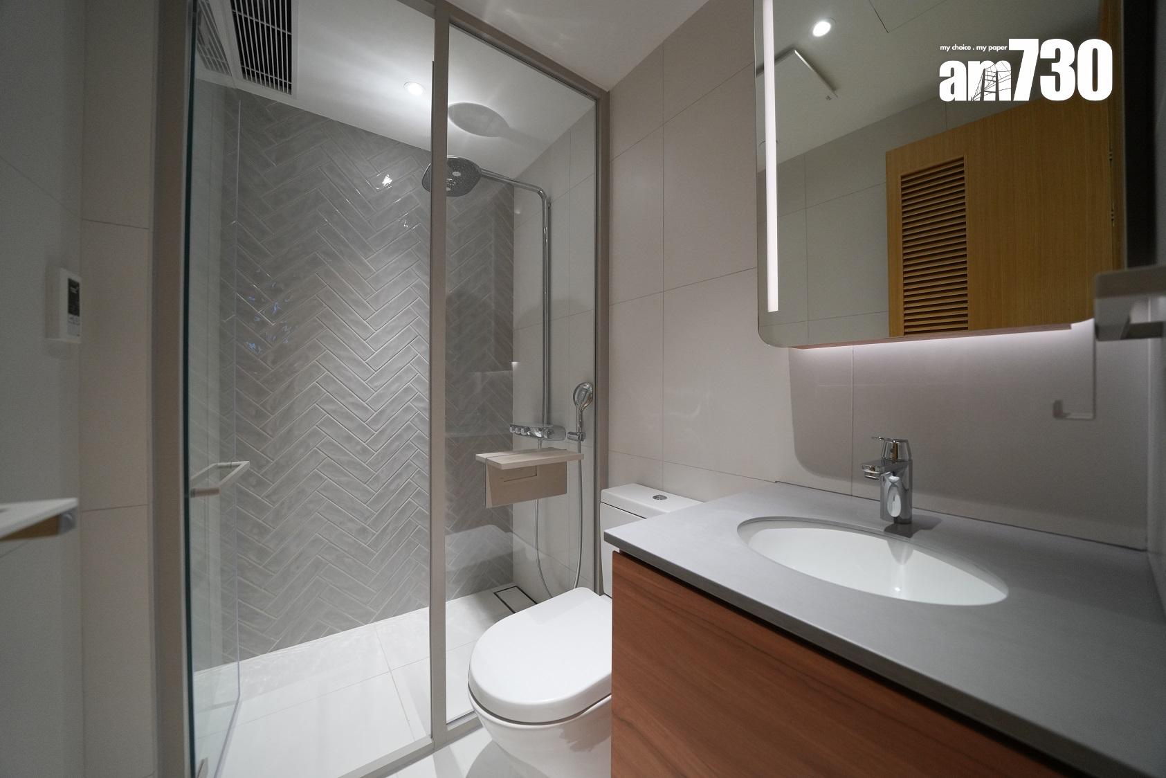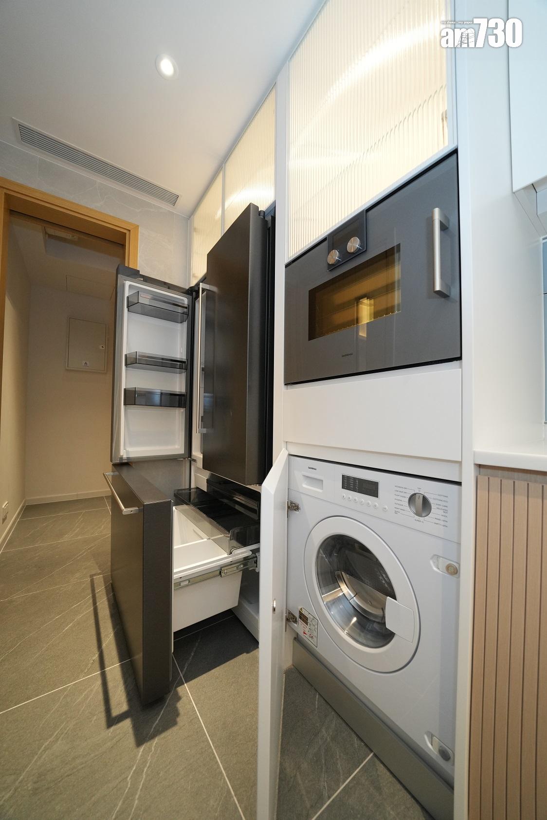廚櫃內設收納式摺疊餐桌,提供額外的煮食空間。家電配備方面,有Gaggenau蒸焗爐、雪櫃、電磁爐、雙爐頭煤氣煮食爐、洗衣乾衣機及抽油煙機,更附設Vinvautz酒櫃,方便住戶貯藏心中所愛。廚房旁的儲物房間隔工整實用,提供充裕的儲物空間。此外,浴室以深灰色調設計,備有三件頭浴室配備,包括淋浴間、洗手盆及坐廁,亦設有多個置物空間及隱藏式腳踏。